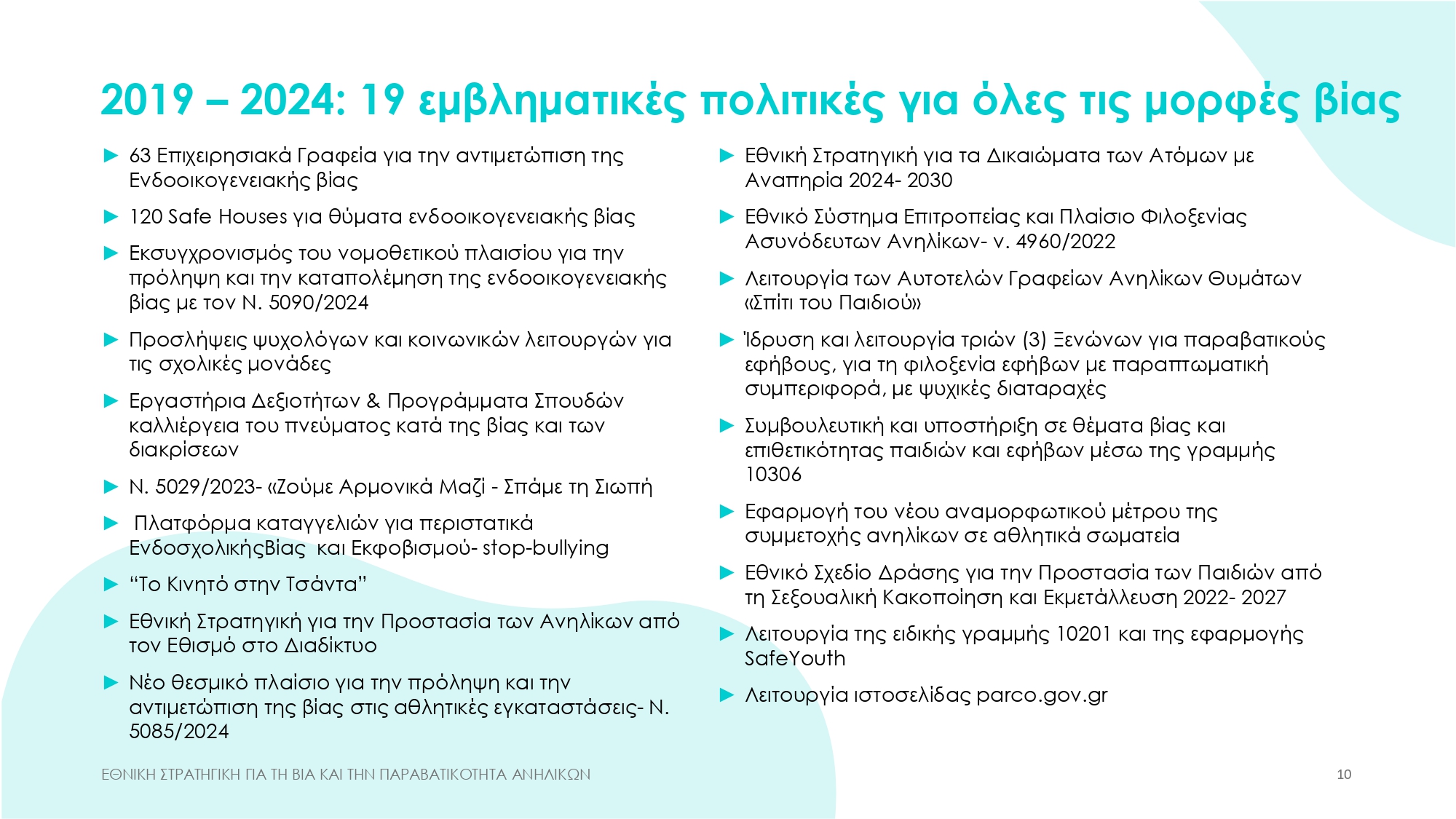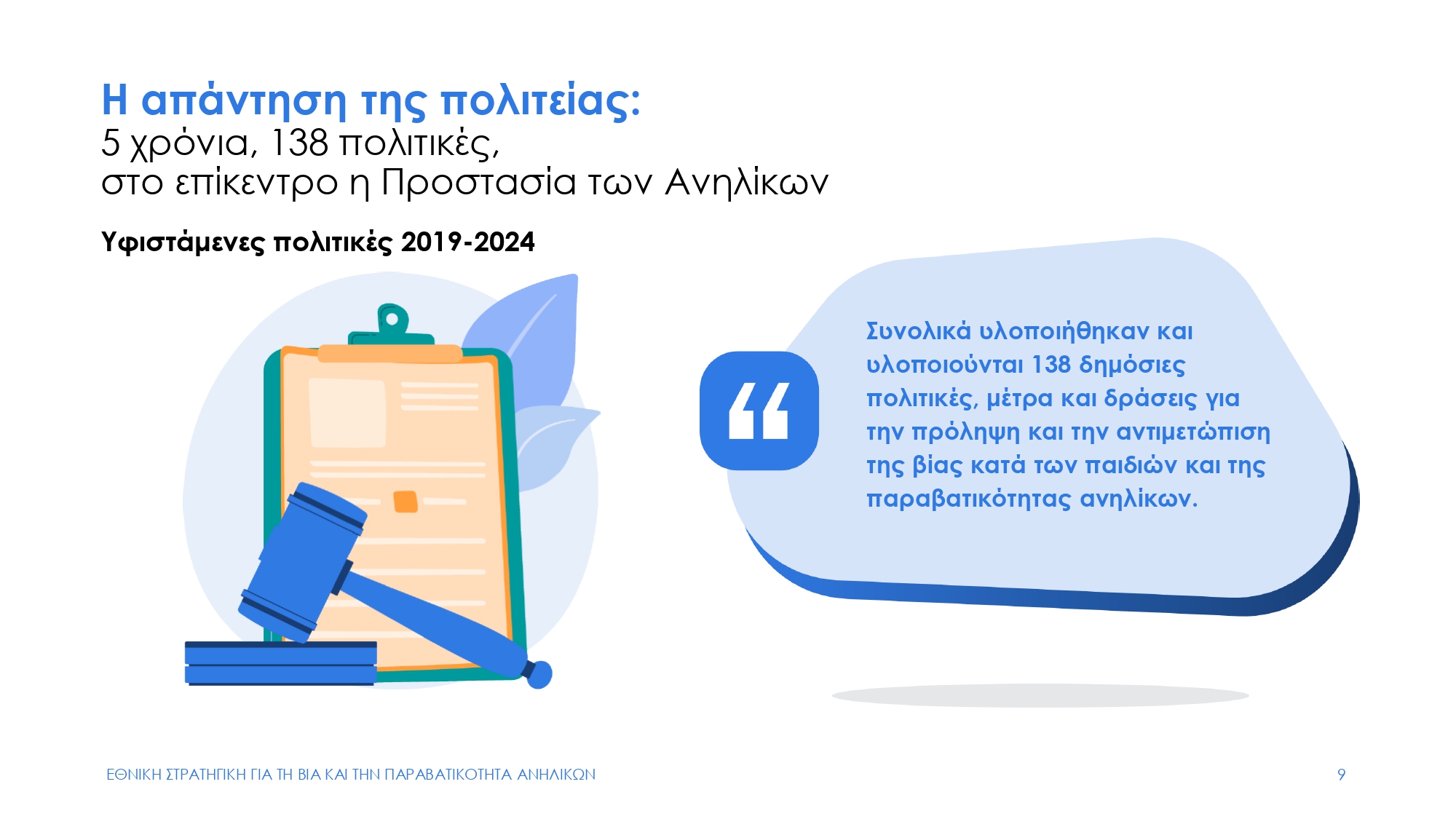 Η νέα Εθνική Στρατηγική ουσιαστικά συνδέει τη δράση 10 Υπουργείων και πολλών φορέων. Αποσκοπεί στην πρόληψη και την αντιμετώπιση των έξι κύριων μορφών που λαμβάνει η βία: