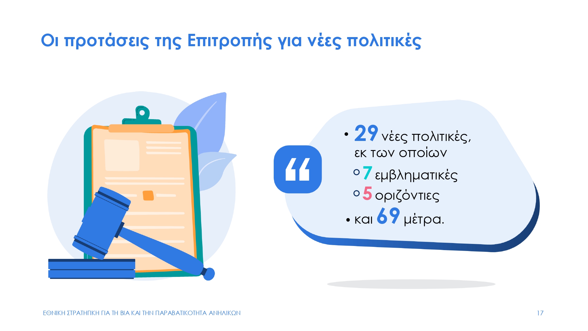 Περιλαμβάνει 29 νέες πολιτικές, εκ των οποίων επτά εμβληματικές και πέντε οριζόντιες, 69 δράσεις, ενώ θεσπίζονται 38 δείκτες παρακολούθησης.
