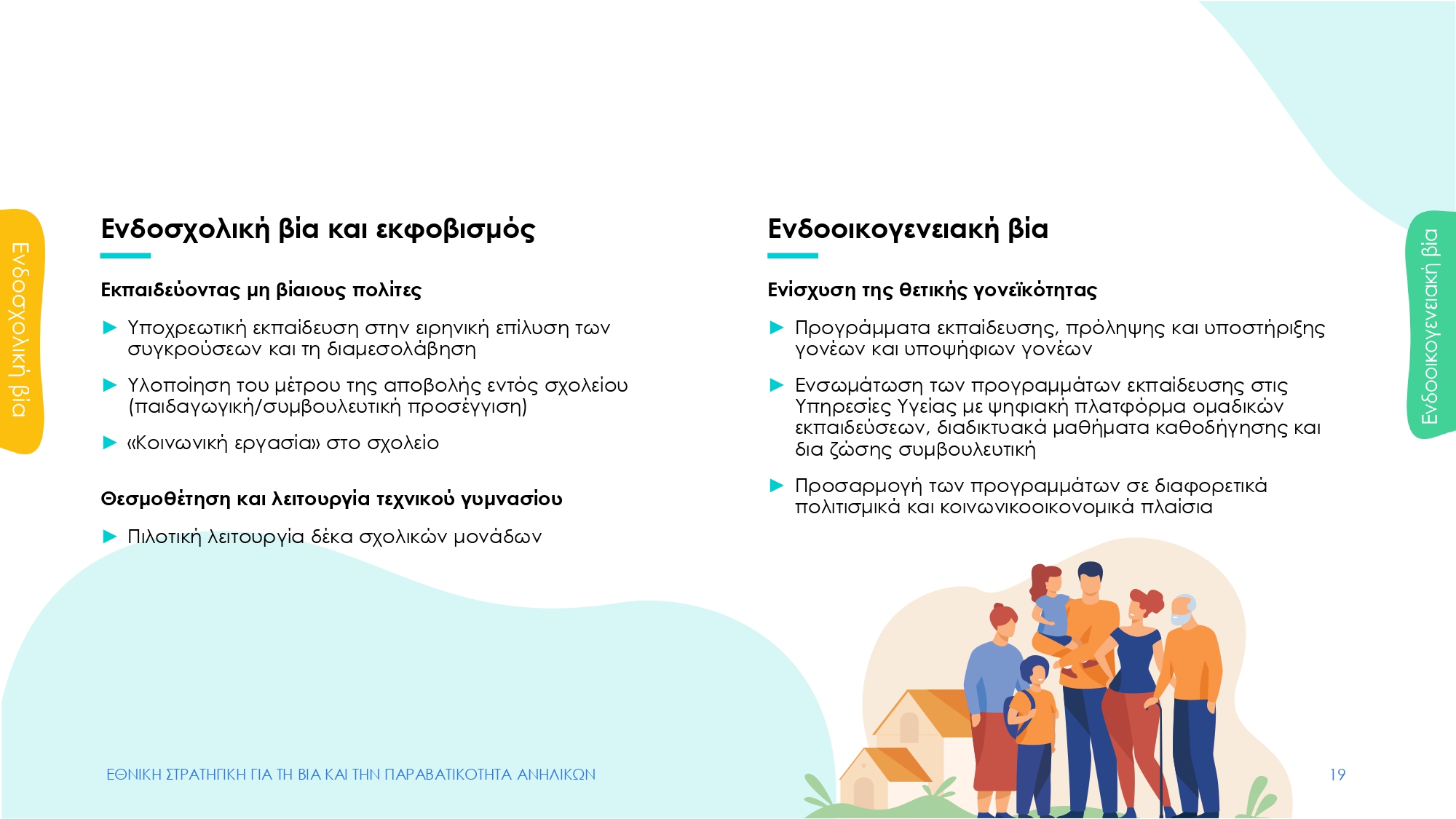 Για την εξάλειψη της ενδοοικογενειακής βίας, δίνεται έμφαση στην καλλιέργεια της θετικής γονεϊκότητας. Προβλέπονται προγράμματα εκπαίδευσης, πρόληψης και υποστήριξης γονέων ή επίδοξων γονέων, με διαδικτυακά μαθήματα και δια ζώσης συμβουλευτική.