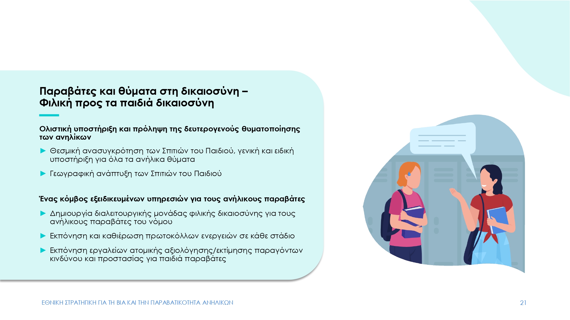 Με γνώμονα τη φιλική προς τα παιδιά Δικαιοσύνη, προβλέπονται για τα μεν ανήλικα θύματα η θεσμική ανασυγκρότηση των Σπιτιών του Παιδιού, η γεωγραφική εξάπλωση και η περαιτέρω υποστήριξή τους, με κύριο στόχο την αποτροπή της δευτερογενούς θυματοποίησης. Για τους ανήλικους παραβάτες, προβλέπεται μεταξύ άλλων η δημιουργία διαλειτουργικής μονάδας φιλικής Δικαιοσύνης, με πρωτόκολλα ενεργειών σε κάθε στάδιο και εργαλεία ατομικής αξιολόγησης και εκτίμησης παραγόντων κινδύνου.