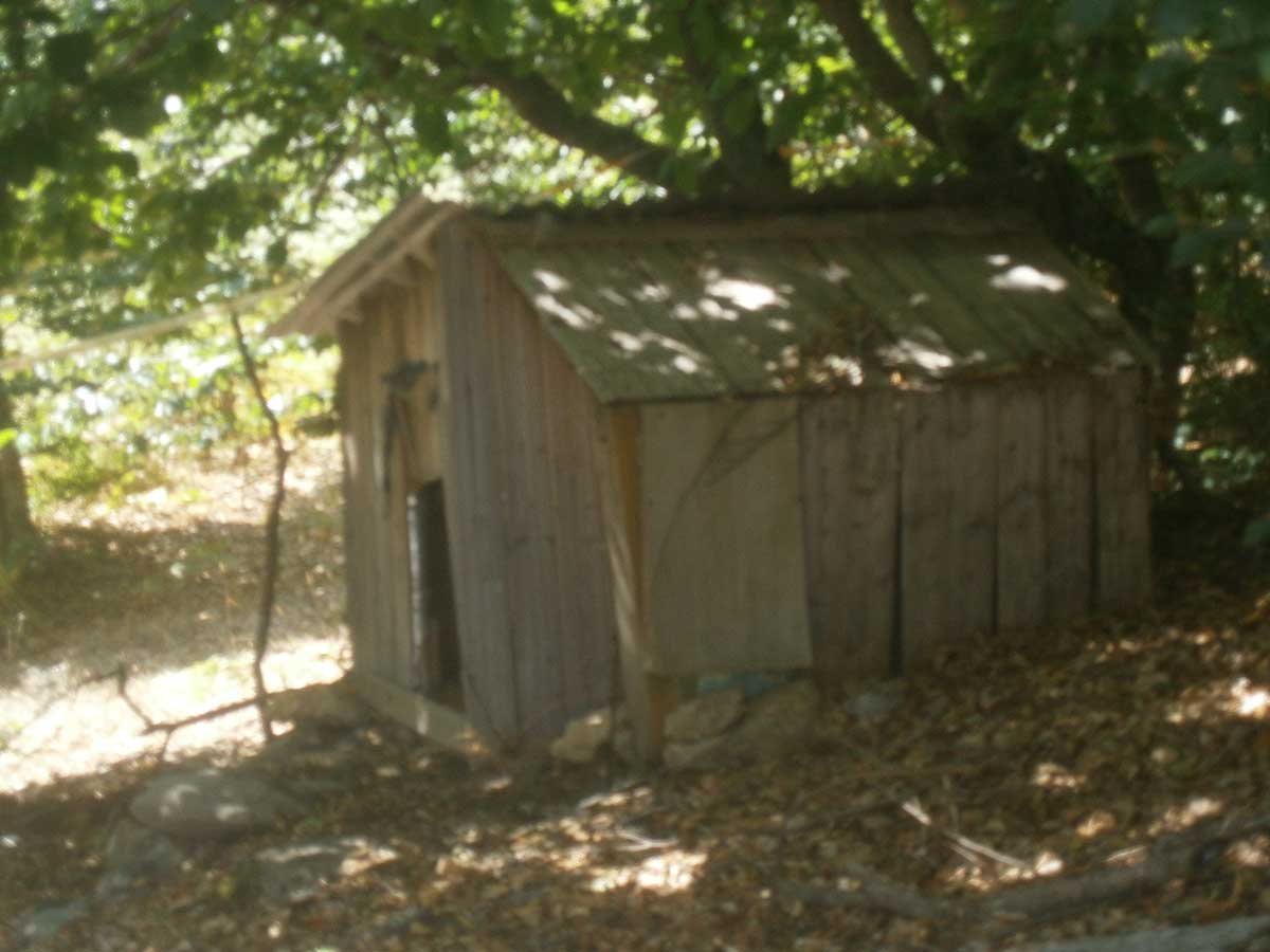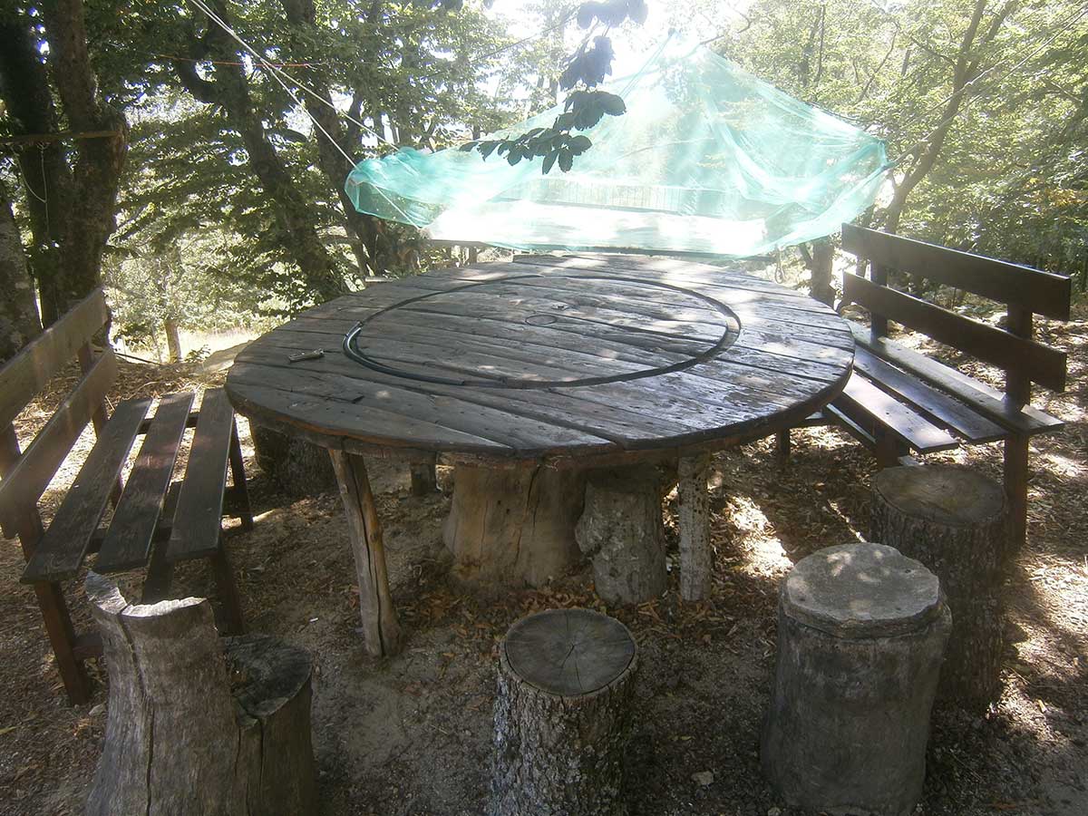 Με πολλή όρεξη και μεράκι δημιούργησε ξύλινες κατασκευές όπως καλυβάκι για να προστατεύεται από τις αντίξοες καιρικές συνθήκες, κρεβάτια πάνω στα δέντρα, αιώρες όπου χαλαρώνει και απολαμβάνει την ηρεμία της φύσης… τραπεζαρία και μπάνιο.