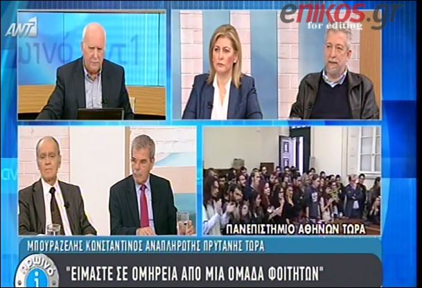 Ο αντιπρύτανης του Καποδιστριακού Πανεπιστημίου Αθηνών, Κωνσταντίνος Μπουραζέλης, τόνισε ότι τα μέλη της συγκλήτου βρίσκονται σε ομηρία από ομάδα φοιτητών.