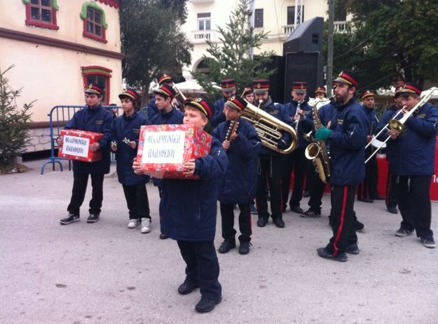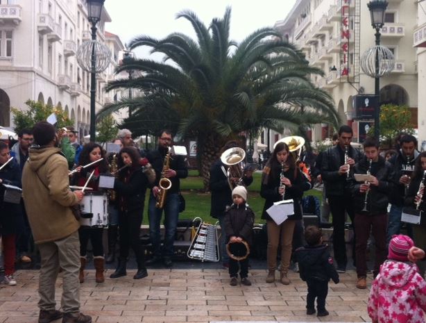 Μπάντες σε διάφορα σημεία του κέντρου της Θεσσαλονίκης τραγουδούν τα πρωτοχρονιάτικα κάλαντα, δίνοντας μια γιορτινή μελωδία στην πόλη.
