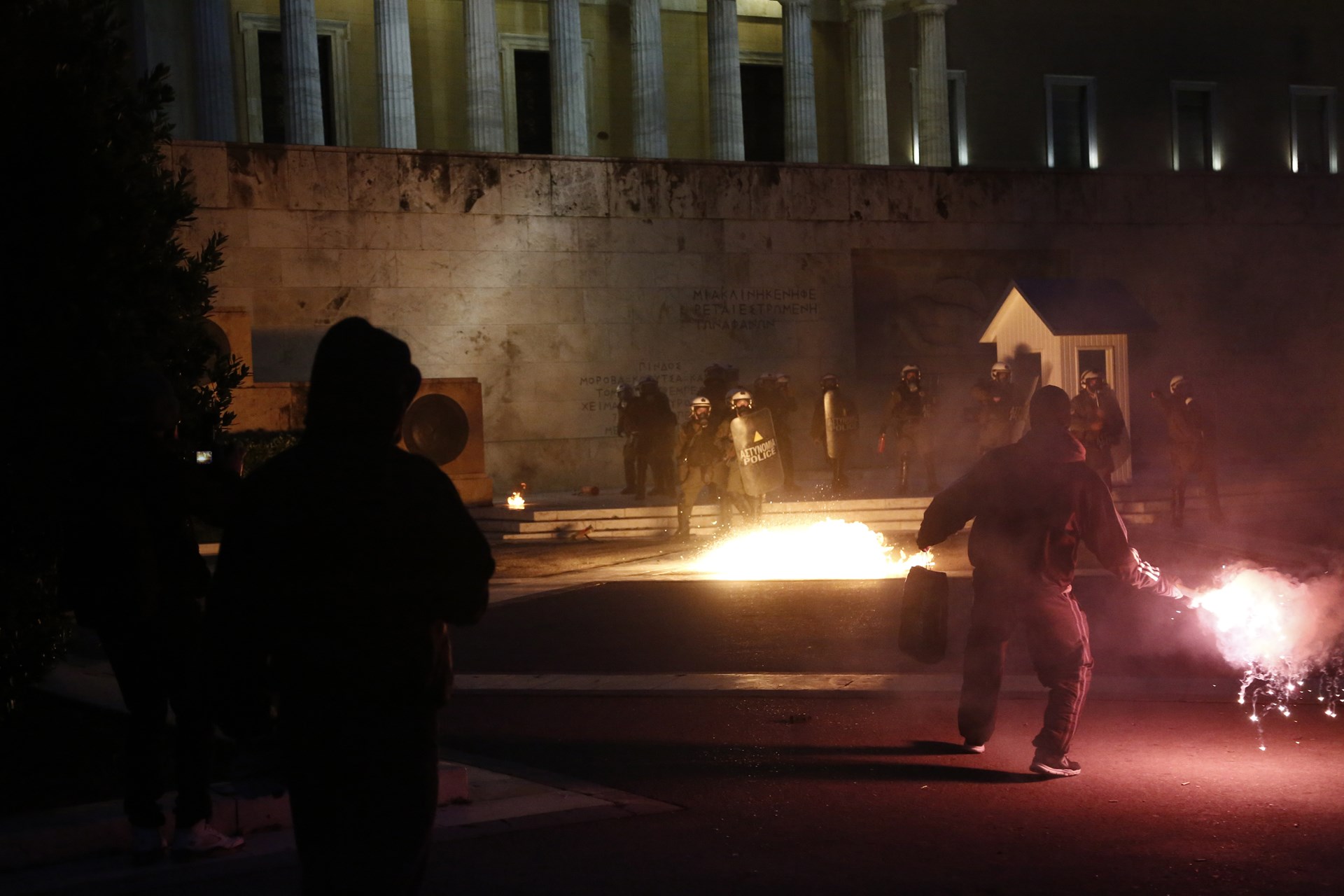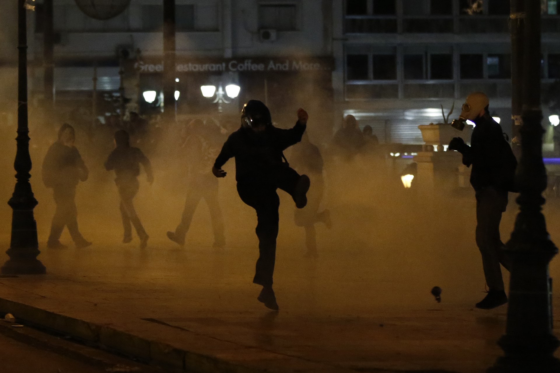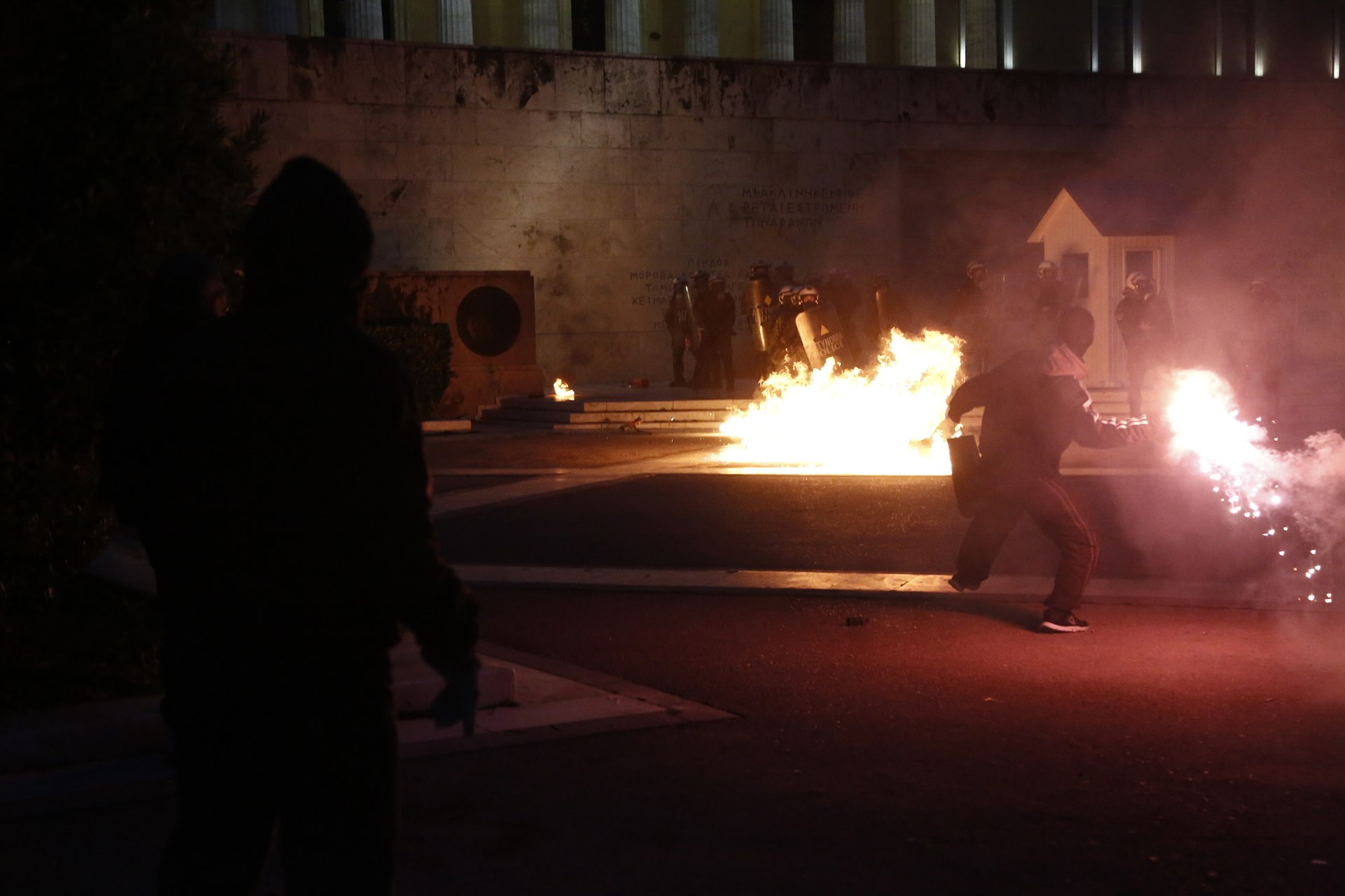 Τα επεισόδια αναζωπυρώθηκαν και μετατοπίστηκαν στη συμβολή των οδών Γεωργίου Α’ και Πανεπιστημίου μπροστά από τη Μεγάλη Βρετανία, με την ατμόσφαιρα να γίνεται αποπνικτική.Για τα επεισόδια που σημειώθηκαν μπροστά από τον Άγνωστο Στρατιώτη στο Σύνταγμα, η αστυνομία προχώρησε σε μια σύλληψη και δύο προσαγωγές. Σύμφωνα με πληροφορίες του ΑΠΕ-ΜΠΕ προερχόμενες από αστυνομικές πηγές, στην κατοχή του συλληφθέντος βρέθηκαν ένα τσεκούρι και ένα σφυρί.