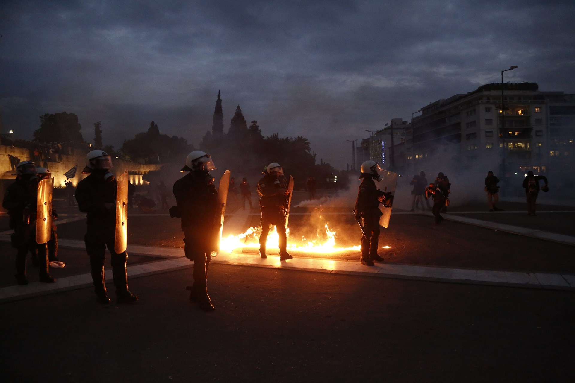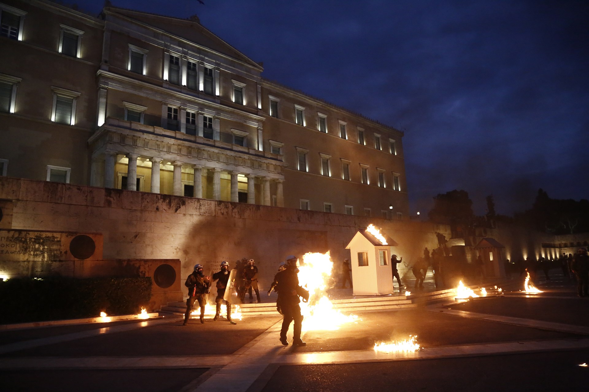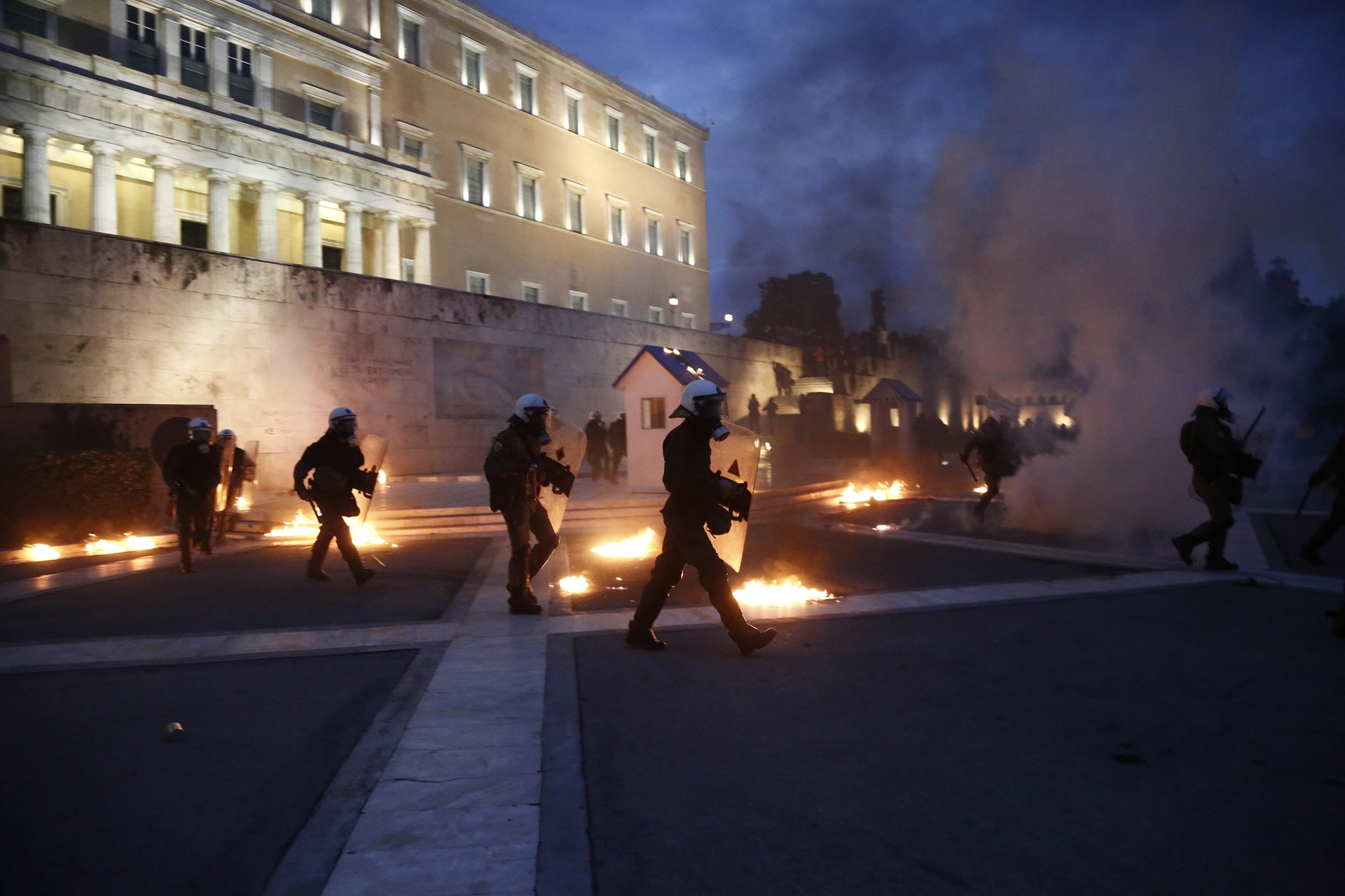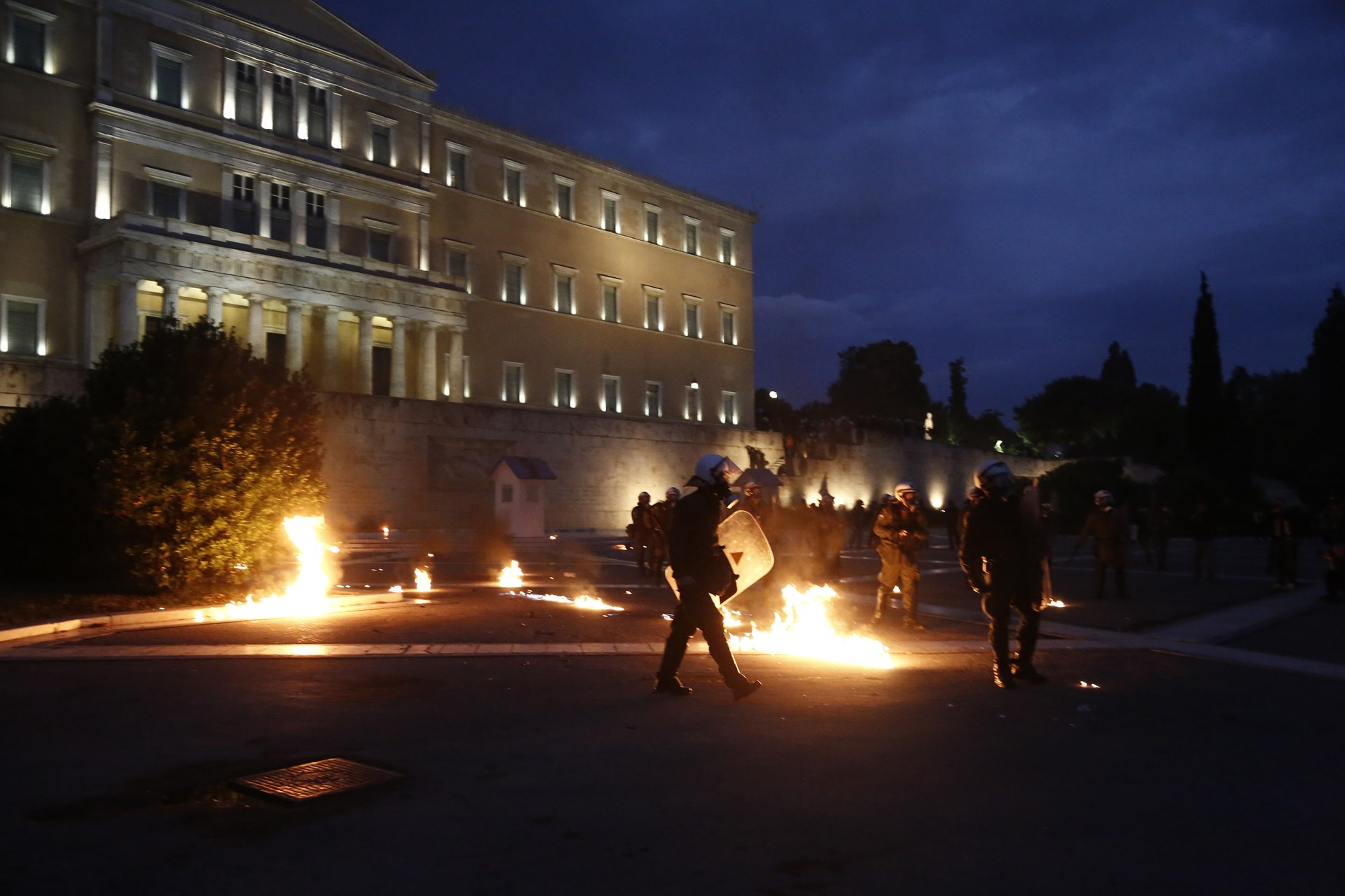 Εκτεταμένα επεισόδια σημειώθηκαν μπροστά από τη Βουλή κατά τη διάρκεια της συγκέντρωσης διαμαρτυρίας ενάντια στο πολυνομοσχέδιο, που πραγματοποιήθηκε στο κέντρο της Αθήνας.Όλα ξεκίνησαν όταν πολίτες προσπάθησαν να ανέβουν τα σκαλιά της Βουλής και ομάδες κουκουλοφόρων εισχώρησαν και άρχισαν να συγκρούονται με τις δυνάμεις των ΜΑΤ. Οι νεαροί, με καλυμμένα τα πρόσωπά τους. προσπάθησαν να εισβάλουν στο προαύλιο του Κοινοβουλίου, ανεβαίνοντας τα σκαλοπάτια που βρίσκονται δίπλα στο μνημείο του Άγνωστου Στρατιώτη. Οι κουκουλοφόροι πέταξαν «βροχή» από πέτρες, φωτοβολίες και βόμβες μολότοφ κατά των αστυνομικών, οι οποίοι προχώρησαν σε ρίψη δακρυγόνων και χειροβομβίδων κρότου λάμψης για να τους απωθήσουν. Άλλοι νεαροί εκσφενδόνισαν μολότοφ στο φυλάκιο της προεδρικής φρουράς, με αποτέλεσμα αυτό να τυλιχτεί στις φλόγες.