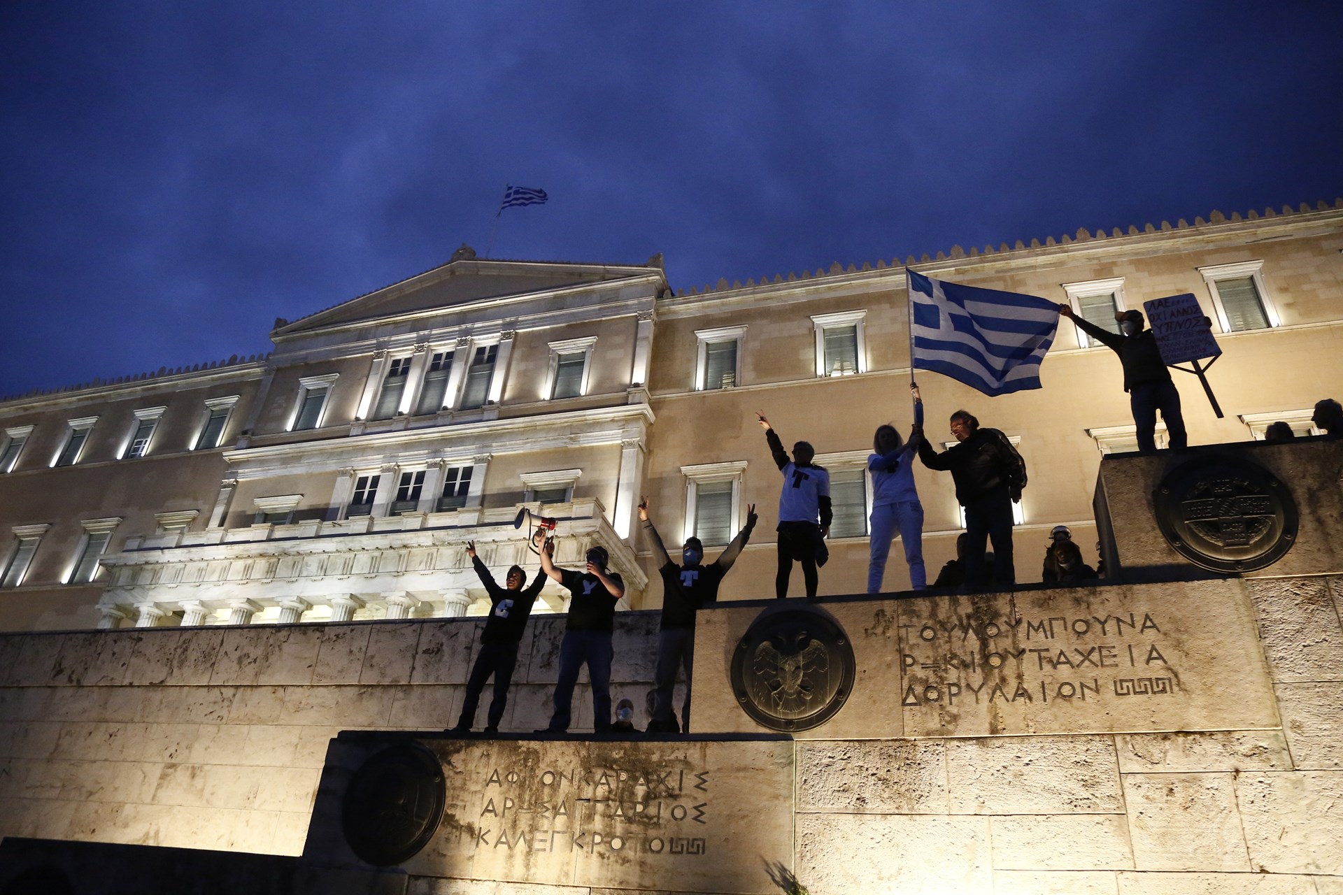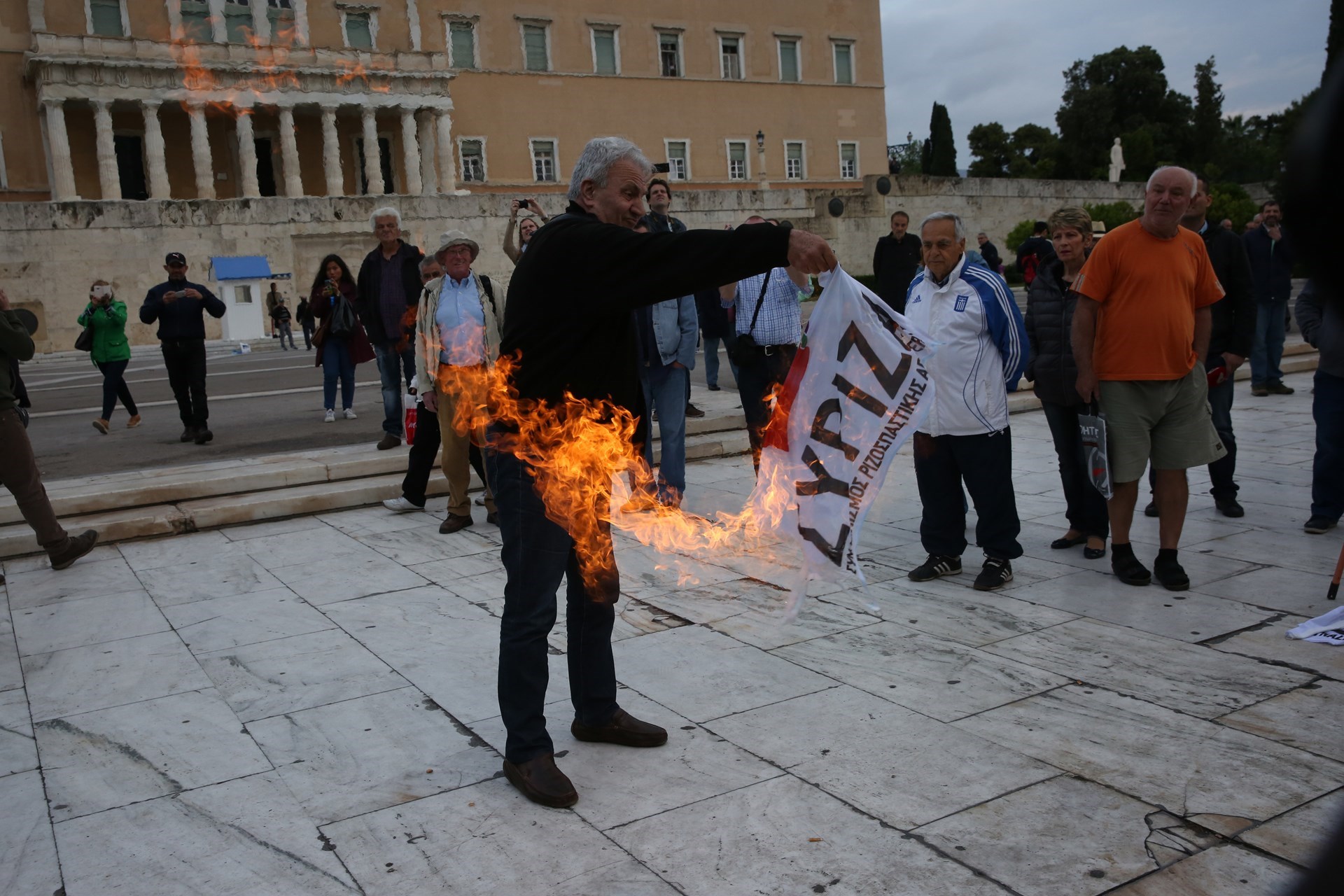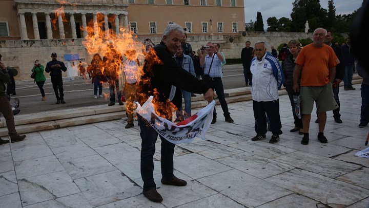 Διαδηλωτές, έξω από τη Βουλή, έκαψαν σημαίες του ΣΥΡΙΖΑ, εις ένδειξη διαμαρτυρίας για την ψήφιση των νέων μέτρων, ενώ άλλοι
