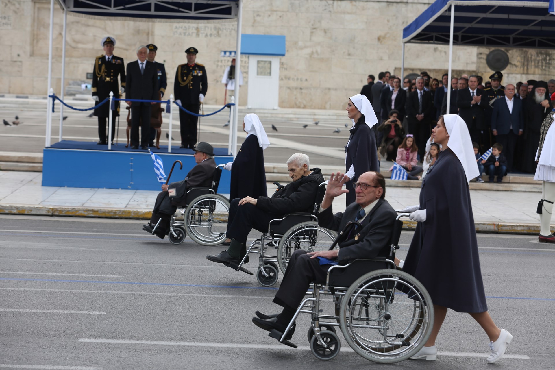Ο Πρόεδρος της Δημοκρατίας συνεχάρη τον έχοντα το γενικό πρόσταγμα διοικητή της στρατιωτικής σχολής Ευελπίδων υποστράτηγο Χαράλαμπο Λαλούση για το άρτιο και άψογο της παρελάσεως, και στη συνέχεια πήγε κοντά στους αναπήρους πολέμους με τους οποίους αντάλλαξε ευχές. Ανταλλαγή ευχών είχε και με τον κόσμο που είχε συγκεντρωθεί στην πλατεία Συντάγματος.