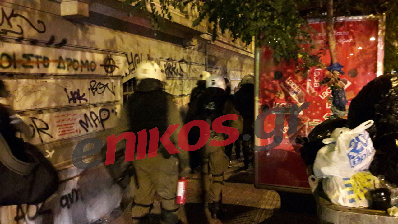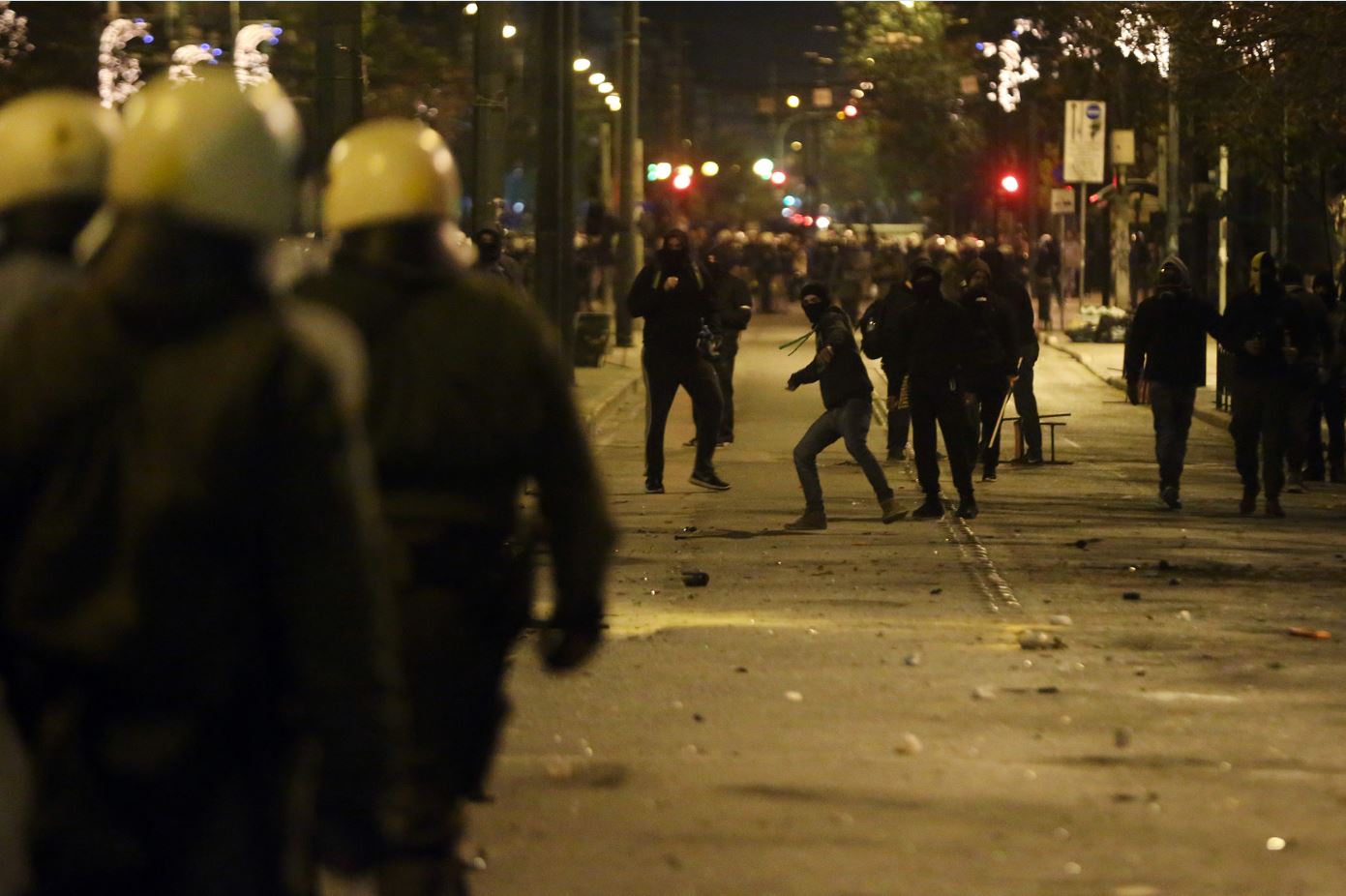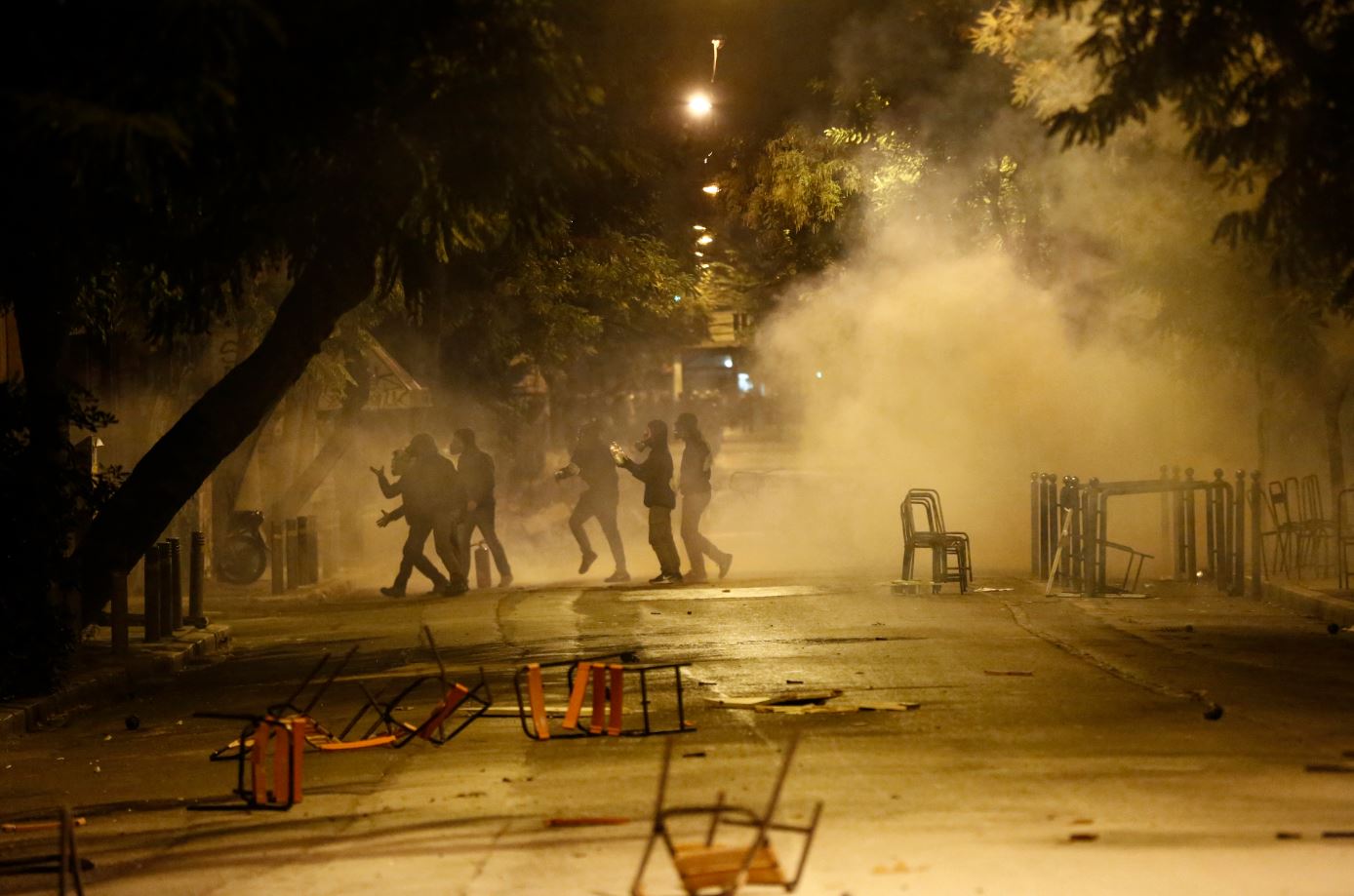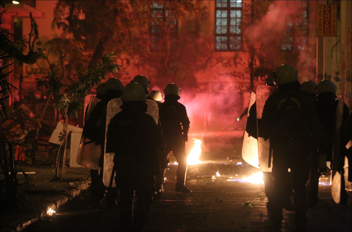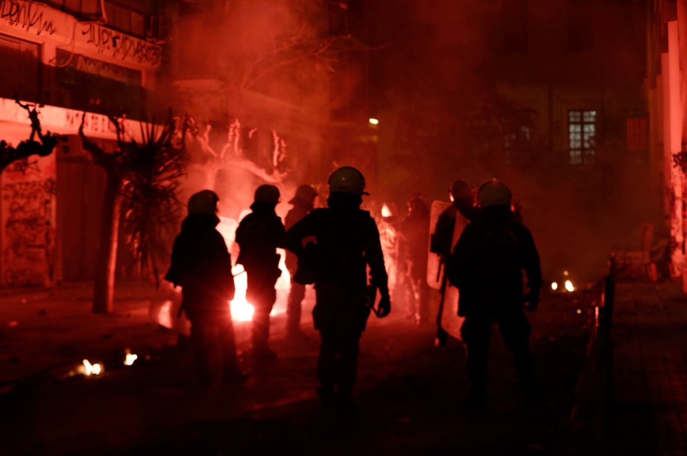 Μετά το τέλος της πορείας, περίπου 100-150 κουκουλοφόροι που βγήκαν από το κτίριο Γκίνη του Ιδρύματος, που τελεί υπό κατάληψη, άρχισαν να πετούν βόμβες μολότοφ, καπνογόνα, πέτρες και ξύλα προς στις Αστυνομικές δυνάμεις που βρίσκονται στην περιοχή. Σύμφωνα με την αστυνομία, αντικείμενα προς τις δυνάμεις ασφαλείας πετούσαν και άτομα από ταράτσες κτιρίων της περιοχής, καθώς και από την ταράτσα του κτιρίου Γκίνη.