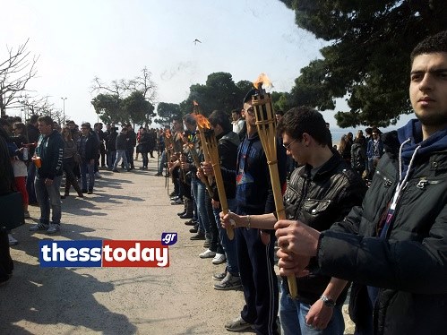 Οι σπουδαστές σχημάτισαν έναν κύκλο γύρω από τον Λευκό Πύργο κρατώντας αναμμένους πυρσούς. Πρόκειται για μια συμβολική κίνηση όπως είπαν, με την οποία θέλουν να δείξουν ότι η επιθυμία και η προσπάθεια να αναδείξουν τον εθνικό και εκπαιδευτικό ρόλο του ΤΕΙ είναι “άσβεστη”.