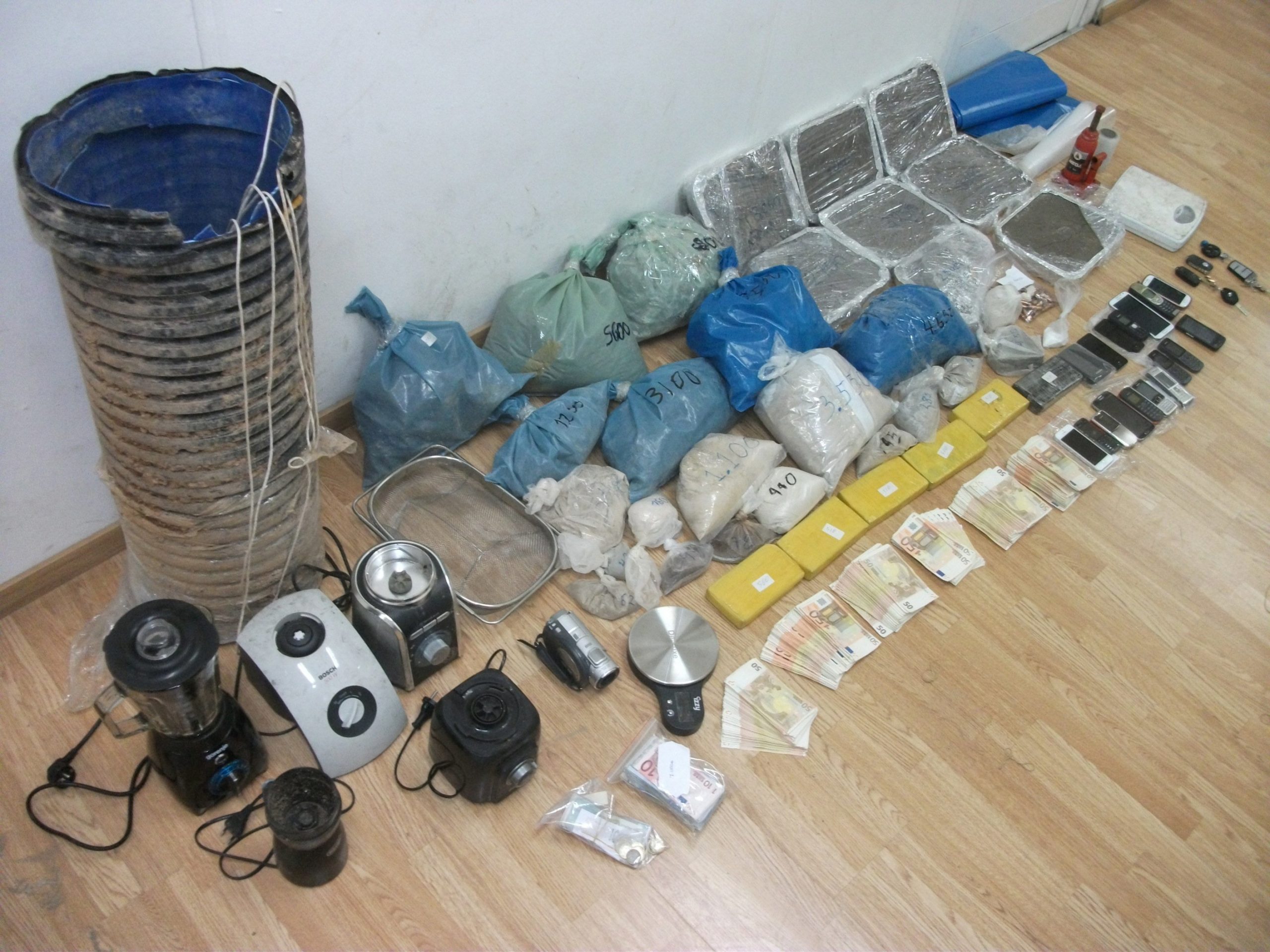 Στο πλαίσιο των ερευνών κατασχέθηκαν επιπλέον, τέσσερα Ι.Χ.Ε. αυτοκίνητα, 17 συσκευές κινητών τηλεφώνων, 2 ηλεκτρονικές ζυγαριές ακριβείας, 1 βιντεοκάμερα, καθώς και πλήθος εργαλείων για την νόθευση και επανασυσκευασία των ναρκωτικών ουσιών.