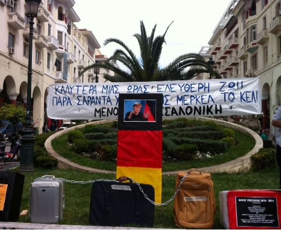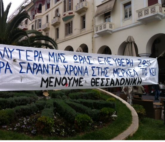Με αφορμή την παρουσία της Άνγκελας Μέρκελ στην Αθήνα, τα μέλη της ομάδας συγκεντρώθηκαν στην Τσιμισκή, στο ύψος της Αριστοτέλους και ανήρτησαν πανό, που αναγράφει “Καλύτερα μιας ώρας ελεύθερης ζωής, παρά 40 χρόνια στης Μέρκελ το κελί”.