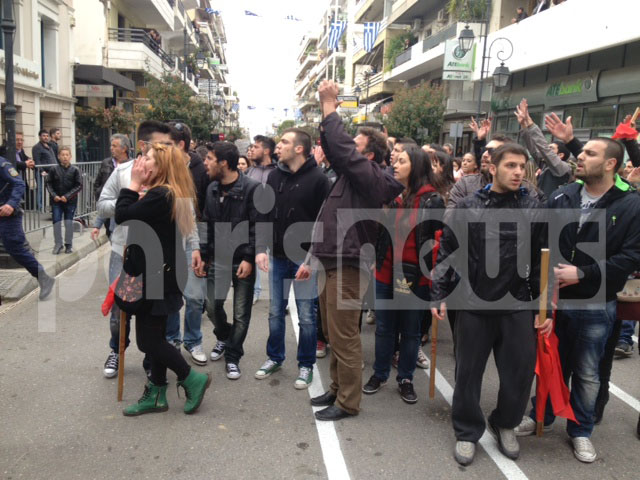 Διασχίζοντας την οδό Πατρών έφτασαν στο κτίριο στην είσοδο του οποίου είχαν παραταχθεί ισχυρές αστυνομικές δυνάμεις. Οι συγκεντρωθέντες υποστήριξαν ότι η σύλληψη έγινε χωρίς λόγο ενώ από πλευράς Αστυνομίας δεν υπήρξε επίσημη απάντηση για τον λόγο της σύλληψης.