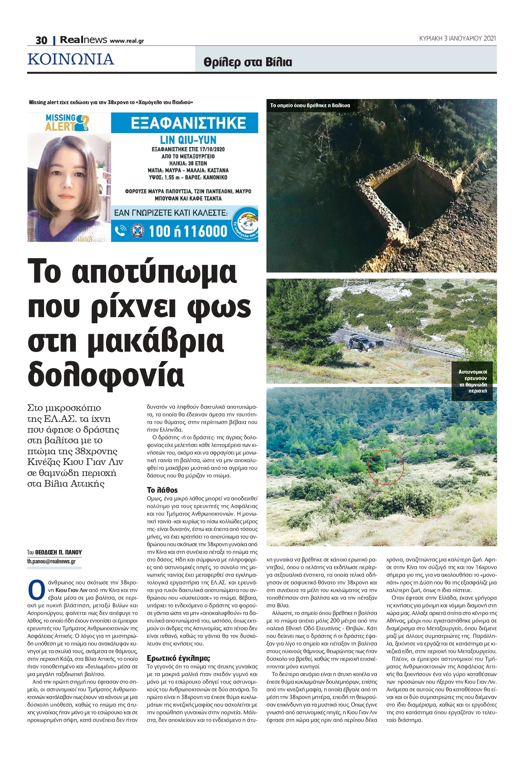 Ο άνθρωπος που σκότωσε την 38χρονη Κιου Γιαν Λιν από την Κίνα και την έβαλε μέσα σε μια βαλίτσα, σε περιοχή με πυκνή βλάστηση, μεταξύ Βιλίων και Ασπροπύργου, φαίνεται πως δεν απέφυγε το λάθος, το οποίο ήδη έχουν εντοπίσει οι έμπειροι ερευνητές του Τμήματος Ανθρωποκτονιών της Ασφάλειας Αττικής. Ο λόγος για τη μυστηριώδη υπόθεση με το πτώμα που ανακάλυψαν κυνηγοί με τα σκυλιά τους, ανάμεσα σε θάμνους, στην περιοχή Κάζα, στα Βίλια Αττικής, το οποίο ήταν τοποθετημένο και «διπλωμένο» μέσα σε μια μεγάλη ταξιδιωτική βαλίτσα. Από την πρώτη στιγμή που έφτασαν στο σημείο, οι αστυνομικοί του Τμήματος Ανθρωποκτονιών κατάλαβαν πως έχουν να κάνουν με μια δύσκολη υπόθεση, καθώς το πτώμα της άτυχης γυναίκας ήταν μόνο με το εσώρουχο και σε προχωρημένη σήψη, κατά συνέπεια δεν ήταν Το αποτύπωμα που ρίχνει φως στη μακάβρια δολοφονία Στο μικροσκόπιο της ΕΛ.ΑΣ. τα ίχνη που άφησε ο δράστης στη βαλίτσα με το πτώμα της 38χρονης Κινέζας Κιου Γιαν Λιν σε θαμνώδη περιοχή στα Βίλια Αττικής δυνατόν να ληφθούν δακτυλικά αποτυπώματα, τα οποία θα έδειχναν άμεσα την ταυτότητα του θύματος, στην περίπτωση βέβαια που ήταν Ελληνίδα. Ο δράστης -ή οι δράστες- της άγριας δολοφονίας είχε μελετήσει κάθε λεπτομέρεια των κινήσεών του, ακόμα και να σφραγίσει με μονωτική ταινία τη βαλίτσα, ώστε να μην αποκαλυφθεί το μακάβριο μυστικό από τα αγρίμια του δάσους που θα μύριζαν το πτώμα.