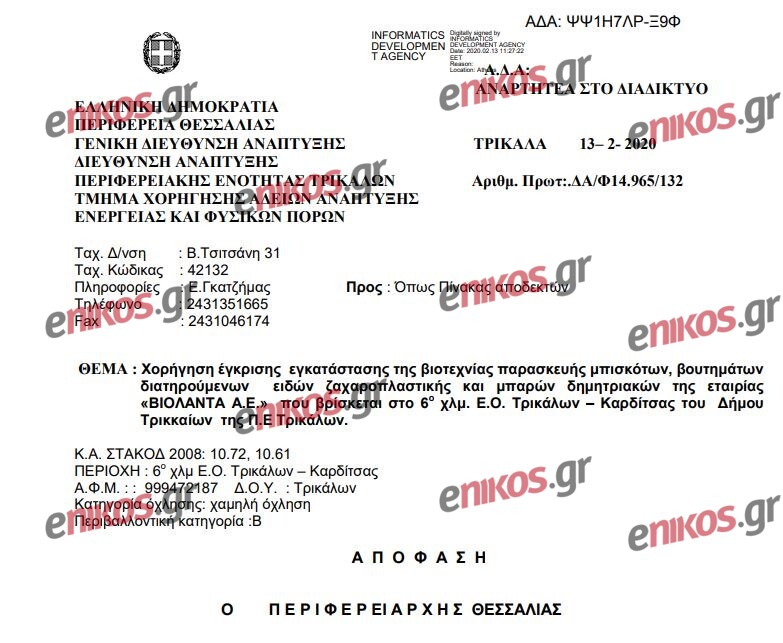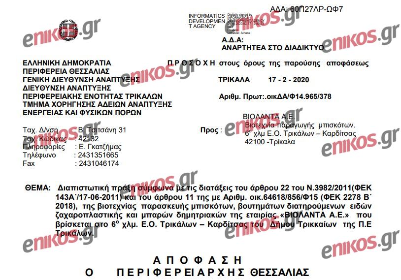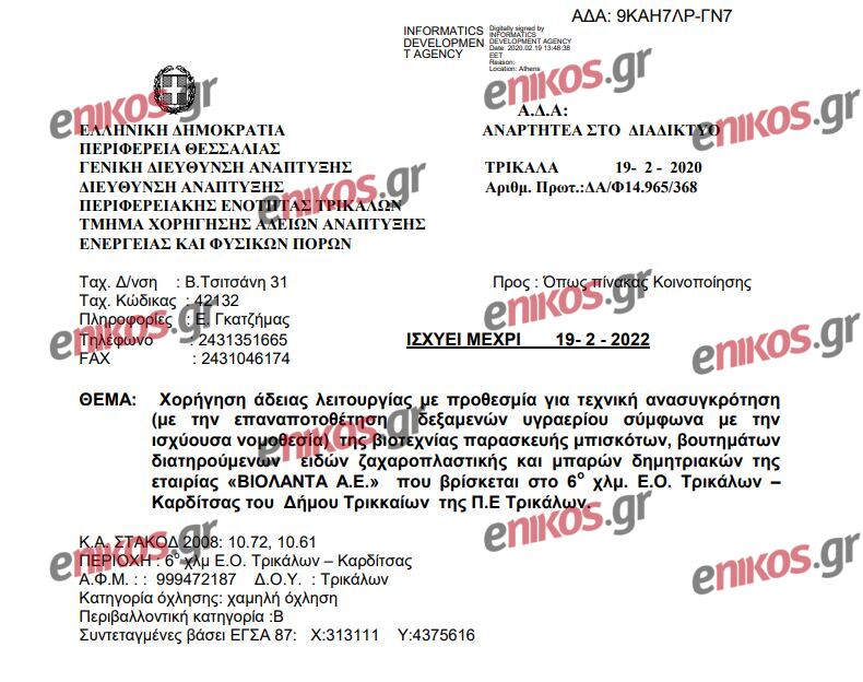 Ας πάρουμε όμως τα πράγματα από την αρχή. Όπως φαίνεται στα έγγραφα που δημοσιεύει το enikos.gr, στις 13 Δεκεμβρίου του 2019 οι υπάλληλοι της Διεύθυνσης Ανάπτυξης της Περιφέρειας Θεσσαλίας σε αυτοψία που πραγματοποίησαν στις εγκαταστάσεις της μπισκοτοβιομηχανίας, είχαν εντοπίσει ότι η τοποθέτηση των δεξαμενών υγραερίου στον χώρο δεν ήταν συμβατή με την ισχύουσα νομοθεσία. Συγκεκριμένα, διαπιστώθηκε μη συμβατότητα της λειτουργίας της βιοτεχνίας, όσον αφορά: «την τοποθέτηση των δεξαμενών δύο υπόγειων δεξαμενών 9.000 λίτρων σε απόσταση μικρότερη των 3 μέτρων από τα όρια ιδιοκτησίας και την τοποθέτηση δύο υπέργειων δεξαμενών 5.000 λίτρων και 9.000 λίτρων σε απόσταση μικρότερη των 7,5 μέτρων από τα όρια ιδιοκτησίας σύμφωνα με τις αποστάσεις που προβλέπεται στην Υ.Α Αριθμ. Δ3/14858/93 /ΦΕΚ 477 Β’)».