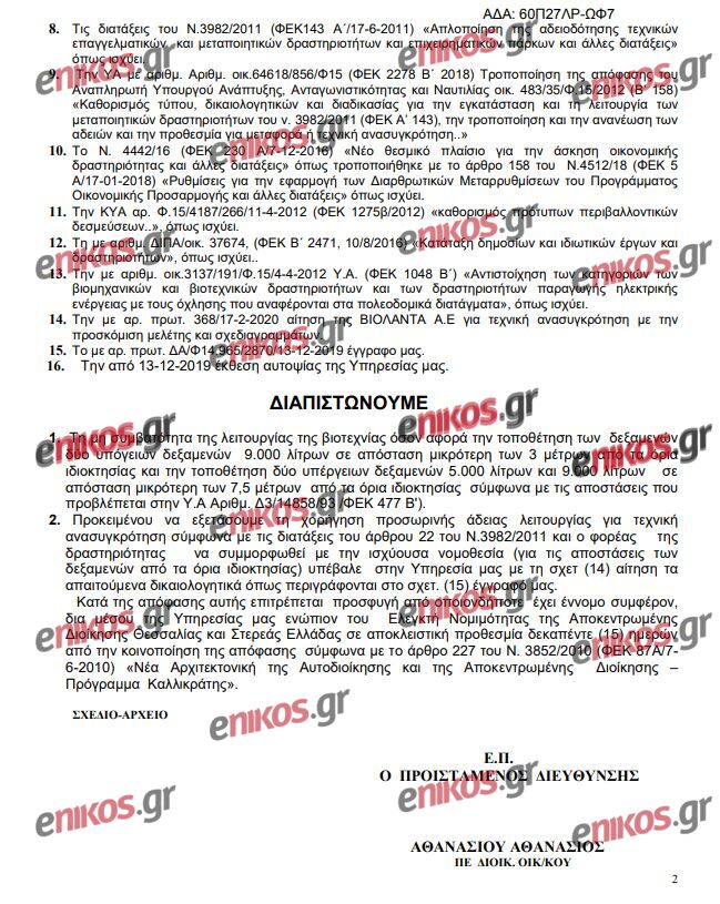 «Η Υπηρεσία μας επιφυλάσσει το δικαίωμα να επιβάλλει την εκτέλεση μεταρρυθμίσεων και περιορισμών στην ανωτέρω εγκατάσταση, σε κάθε περίπτωση που θα διαπιστωθεί ότι είναι αναγκαίο για να εκπληρωθεί ο σκοπός των ως άνω διατάξεων. Ο ενδιαφερόμενος κατά την διάρκεια της παρούσας άδειας να εφοδιαστεί με άδεια δόμησης για την τοποθέτηση των δεξαμενών υγραερίου από την αρμόδια Πολεοδομική Υπηρεσία. Μετά την επιτυχή άρση της μη συμβατότητας και πριν τη λήξη της προθεσμίας, να εφοδιαστεί με υποβάλει γνωστοποίηση λειτουργίας. Σε περίπτωση μη συμμόρφωσης του φορέα θα εφαρμοστούν οι προβλεπόμενες διατάξεις του άρθρου 29 του Ν.3982/2011», καταλήγει το έγγραφο.