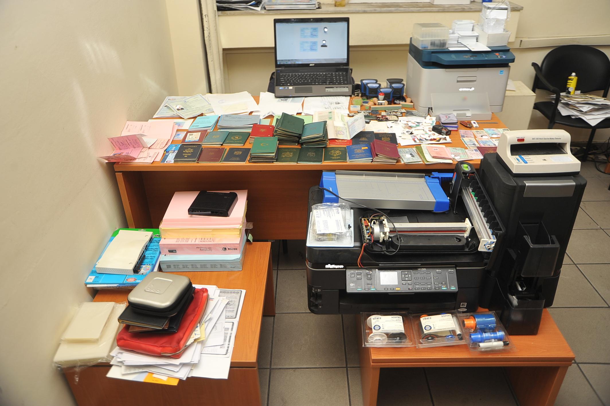 Επίσης, 76 σφραγίδες διαφόρων Υπηρεσιών, πλήθος φωτογραφιών τύπου διαβατηρίου και ένα πλήρες εργαστήριο κατάρτισης πλαστών ταξιδιωτικών εγγράφων.