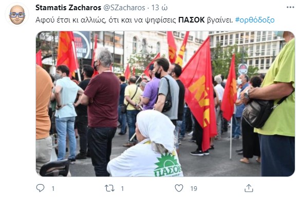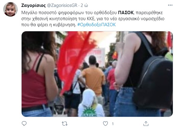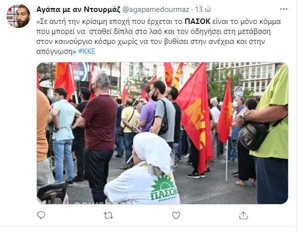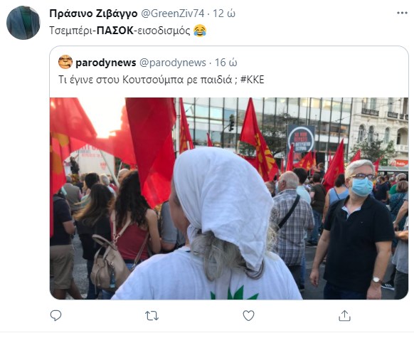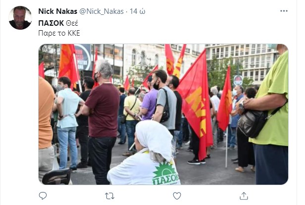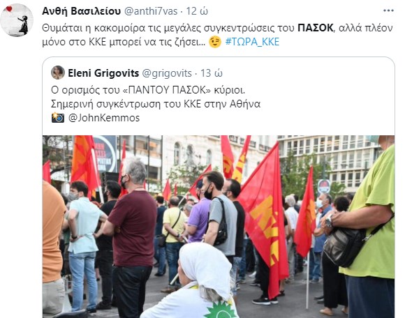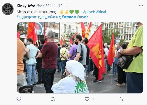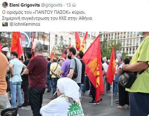 Viral έχει γίνει η ηλικιωμένη που συμμετείχε στη συγκέντρωση του ΚΚΕ, που πραγματοποιήθηκε στο Σύνταγμα, με αφορμή το νέο εργασιακό νομοσχέδιο. Οι ενδυματολογικές της επιλογές ήταν αυτές που συζητήθηκαν, καθώς επέλεξε να φορέσει ένα λευκό μπλουζάκι του ΠΑΣΟΚ, με τον πράσινο ήλιο. Οι φωνογραφίες του Γιάννη Κέμμου έκαναν αμέσως τον γύρο του διαδικτύου, με τα σχόλια να πέφτουν “βροχή”