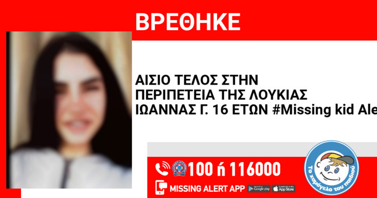 Αίσιο τέλος είχε η περιπέτεια της 16χρονης Λουκίας Ιωάννας Γ., η οποία είχε εξαφανιστεί στις 3 Απριλίου 2025 από την περιοχή του Ορχομενού Βοιωτίας.