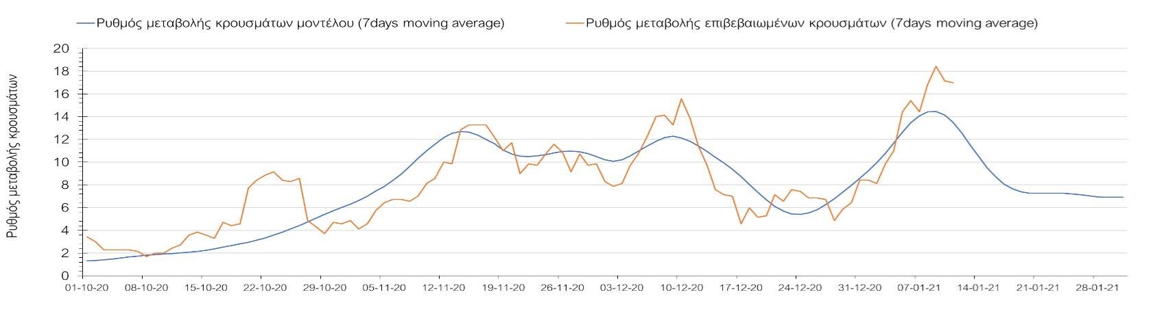 Πορεία του ημερησίου αριθμού των κρουσμάτων (κυλιόμενος μέσος όρος 7 ημερών) στην Βοιωτία