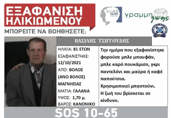 Ο 81χρονος άνδρας, αγνοείται από τις 12 Οκτωβρίου. Κατευθυνόταν από το σπίτι στο καφενείο, στην περιοχή του Άνω Βόλου. Πάσχει από άνοια και η ζωή του βρίσκεται σε κίνδυνο. Το πορτοφόλι του και το τηλέφωνό του βρέθηκαν πεταμένα δίπλα σε κάδο απορριμμάτων στην περιοχή της Χιλιαδούς.