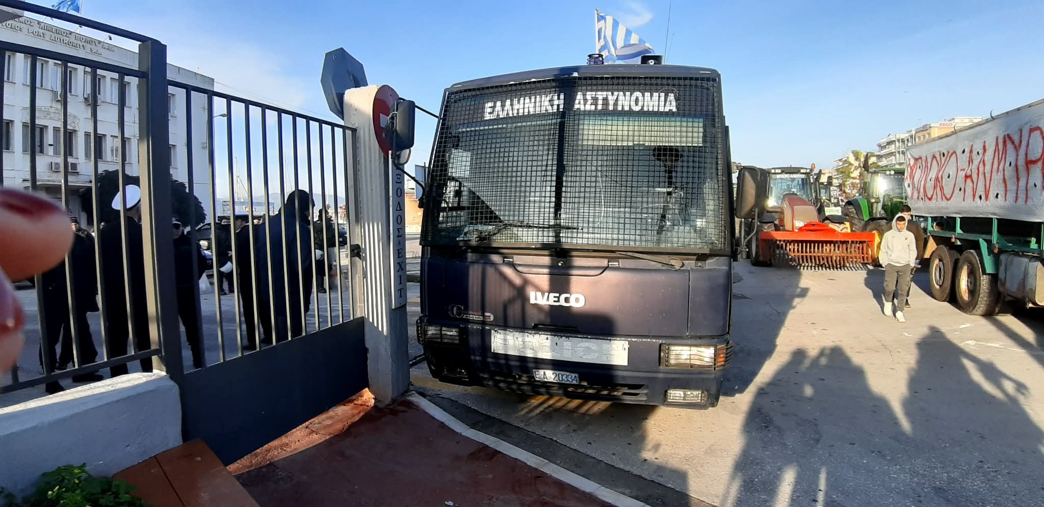 Οι δυνάμεις της αστυνομίας έχουν αποκλείσει τόσο την είσοδο όσο και την έξοδο του επιβατικού λιμανιού. Ισχυρή αστυνομική παρουσία υπάρχει και στο Τελωνείο, όπου τοποθετήθηκε κλούβα των ΜΑΤ, προκειμένου να αποτραπεί οποιαδήποτε πρόσβαση στο σημείο που οι αγρότες σχεδίαζαν να αποκλείσουν. Ίδια εικόνα και στον εμπορευματικό σταθμό του λιμανιού, όπου ήδη έχουν παραταχθεί αστυνομικές δυνάμεις, εμποδίζοντας τους αγρότες να εισέλθουν και εκεί.