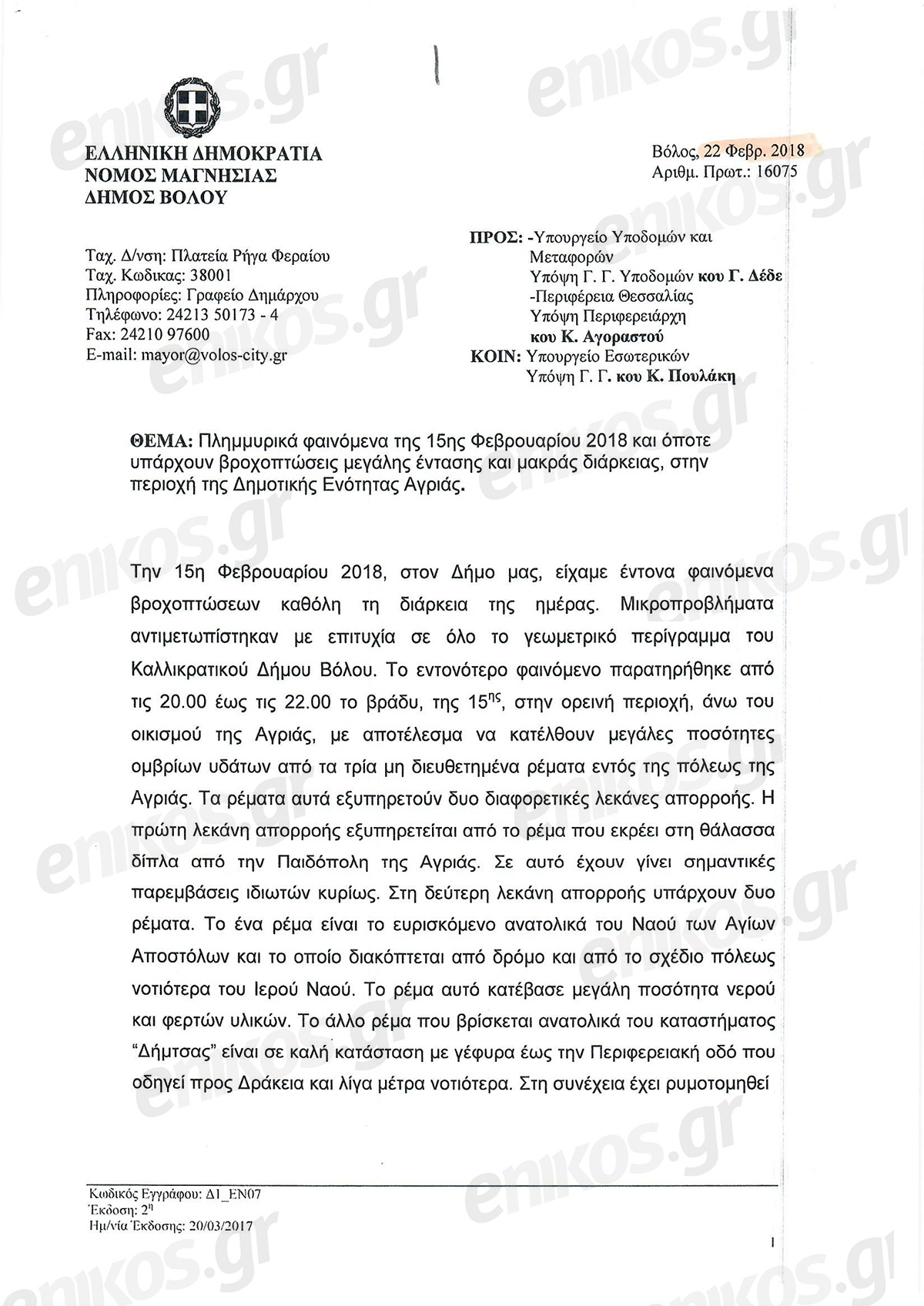 Το enikos.gr αποκαλύπτει σήμερα τα έγγραφα που είχε αποστείλει ο Δήμος Βόλου από το 2018, «χτυπώντας καμπανάκι» ιδίως για την Αγριά, όπου το Δημοτικό Σχολείο, όπως είχε ενημερώσει ο κ. Μπέος, έχει κατασκευαστεί επί κοίτης ρέματος. Σημειώνεται ότι το πέρασμα της κακοκαιρίας Daniel από τον Βόλο και την συγκεκριμένη συνοικία ήταν καταστροφικό. Δρόμοι έγιναν λίμνες, ενώ τα ορμητικά νερά μπήκαν σε σπίτια και προκάλεσαν σοβαρές ζημιές.