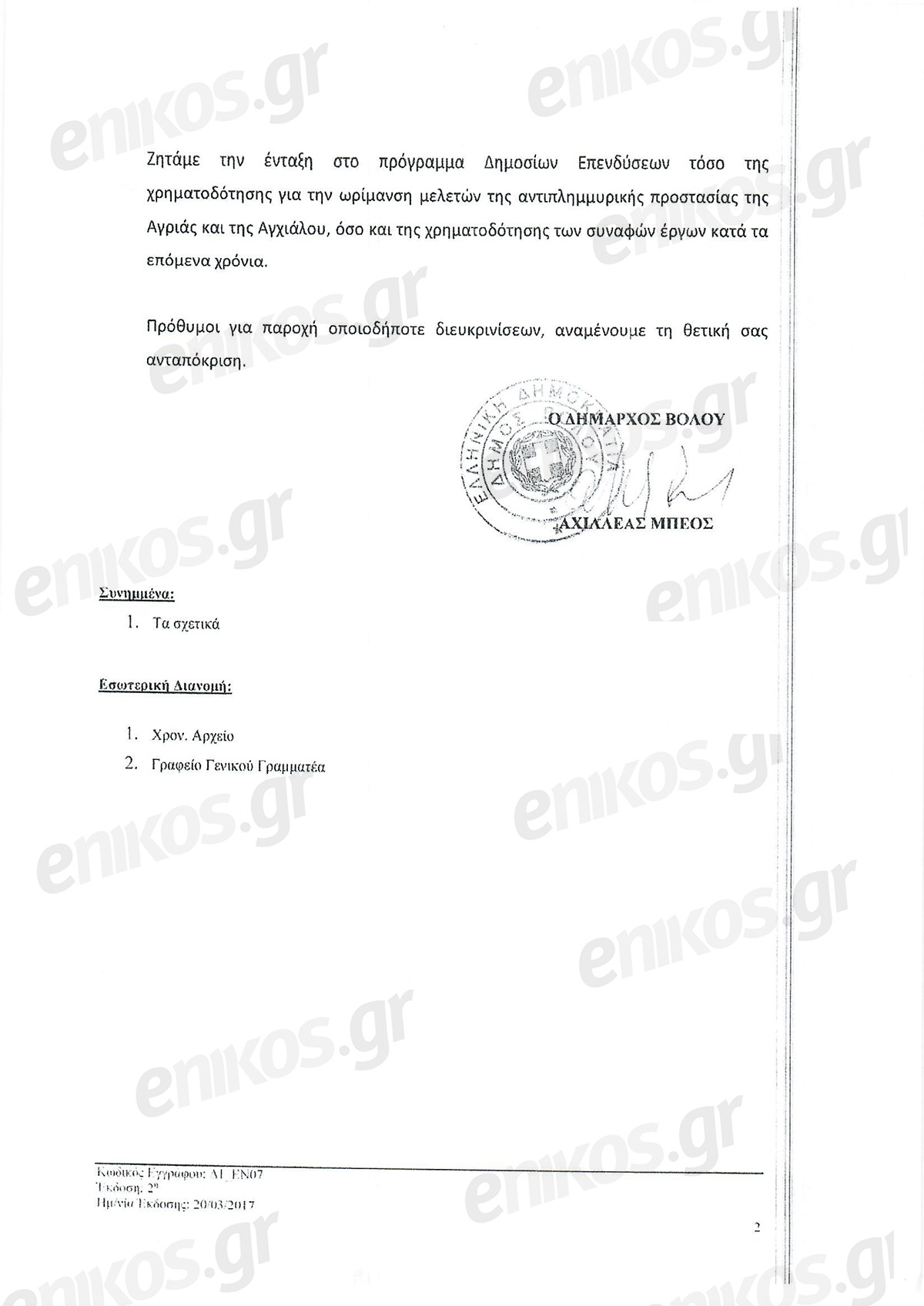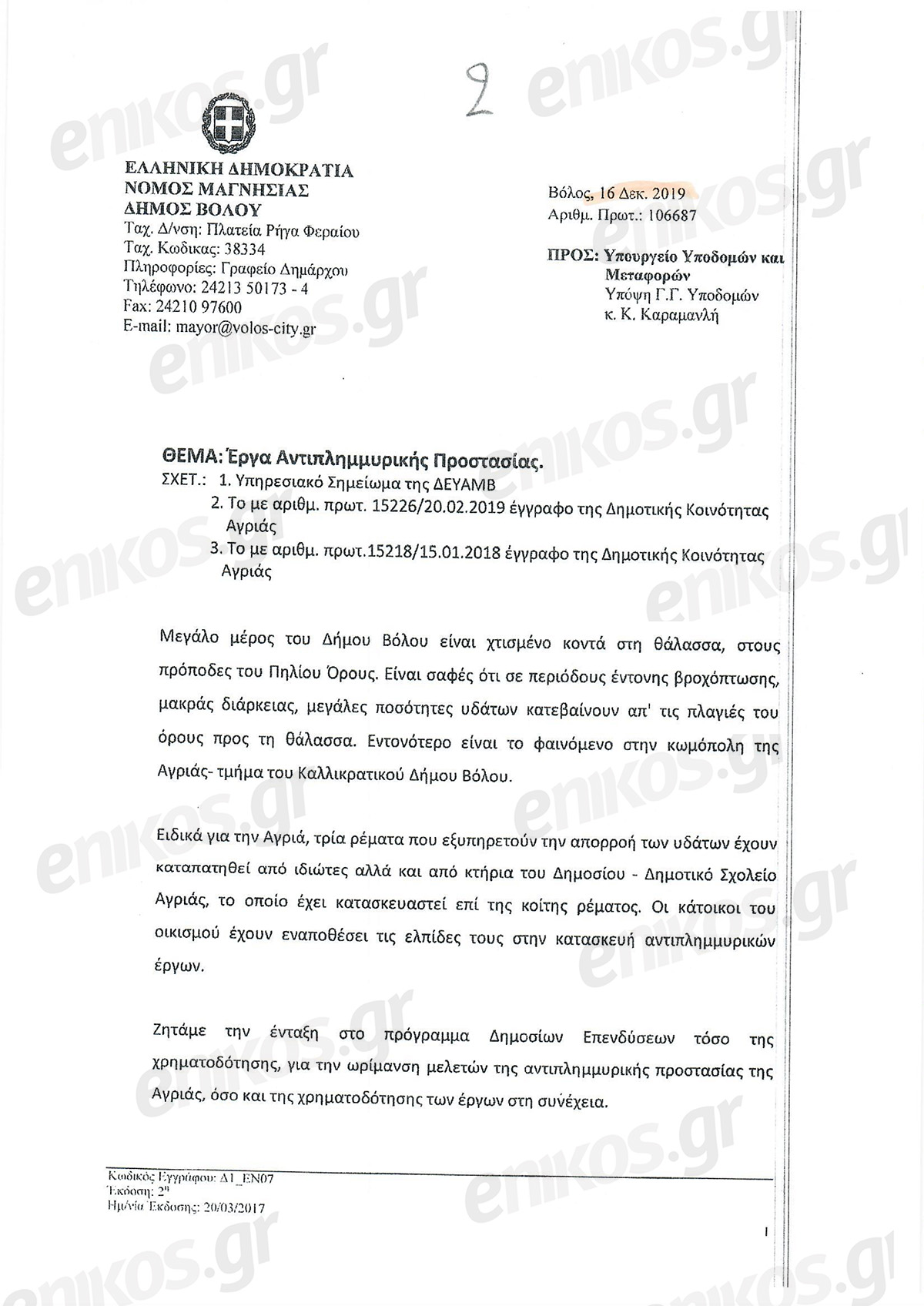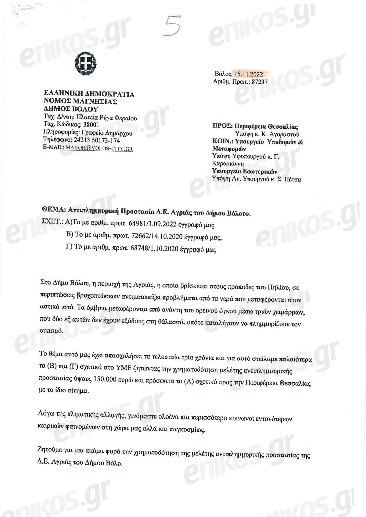 «Ζητάμε την ένταξη στο πρόγραμμα Δημοσίων Επενδύσεων τόσο της χρηματοδότησης, για την ωρίμανση μελετών της αντιπλημμυρικής προστασίας της Αγριάς και της Αγχιάλου, όσο και της χρηματοδότησης των συναφών έργων κατά τα επόμενα χρόνια» αναφέρει χαρακτηριστικά.