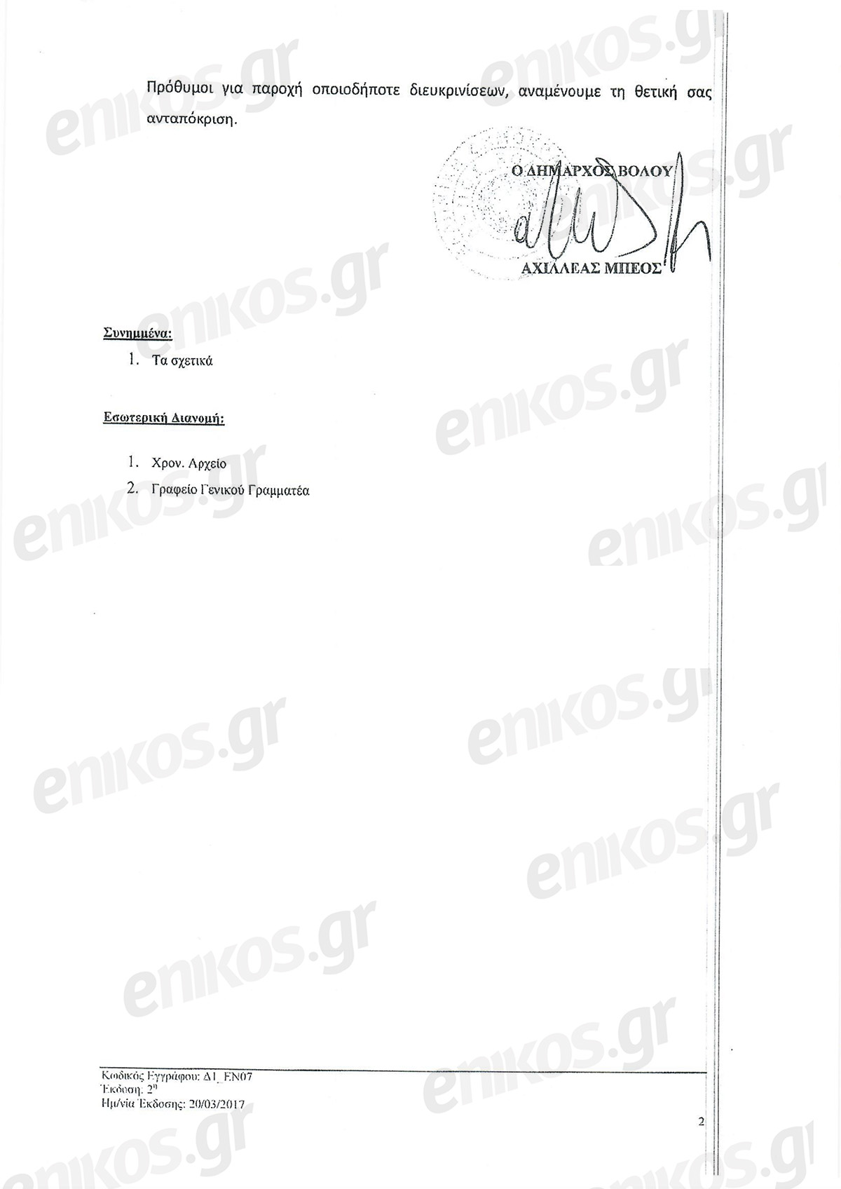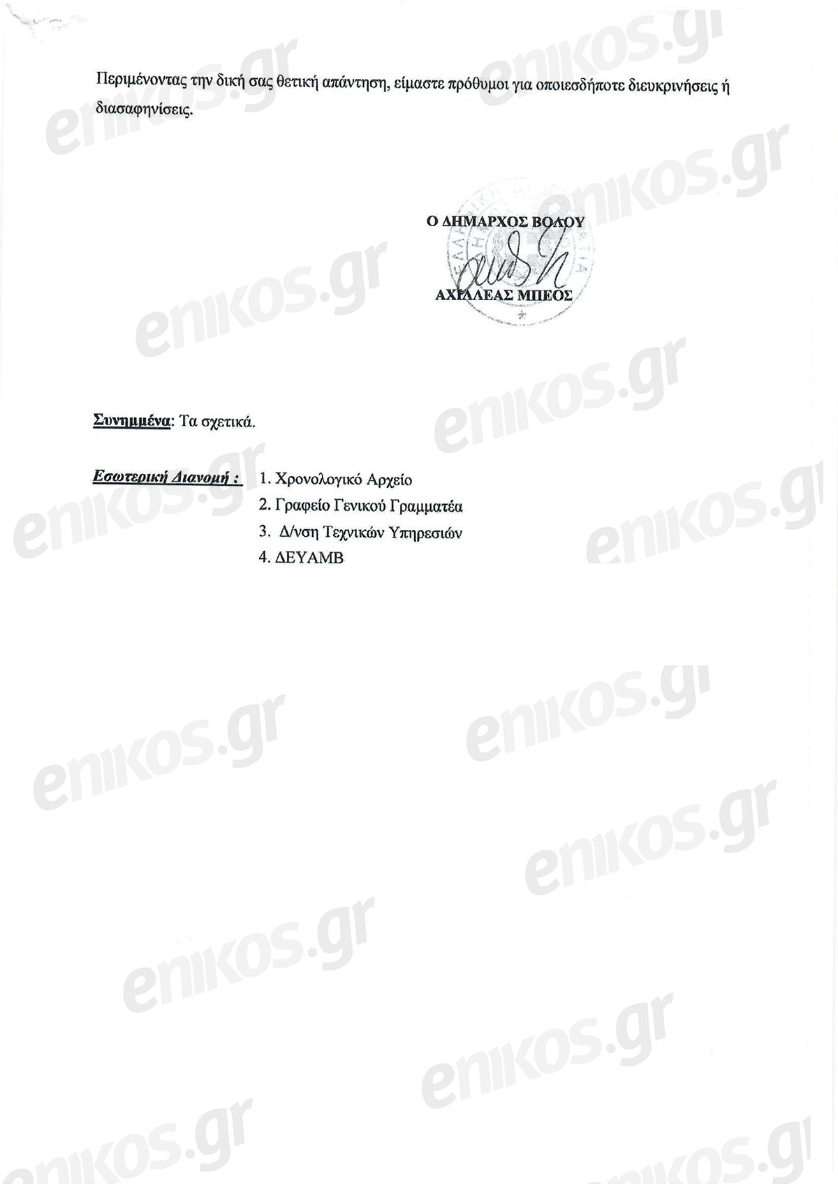 «Περιμένοντας τη δική σας θετική απάντηση, είμαστε πρόθυμοι για οποιεσδήποτε διευκρινίσεις ή διασαφηνίσεις», καταλήγει ο Μπέος στο έγγραφό του. Μια φράση που, όπως μπορεί να παρατηρήσει κάποιος, αναφέρεται μονότονα σε κάθε έγγραφο του δήμου τα τελευταία χρόνια…