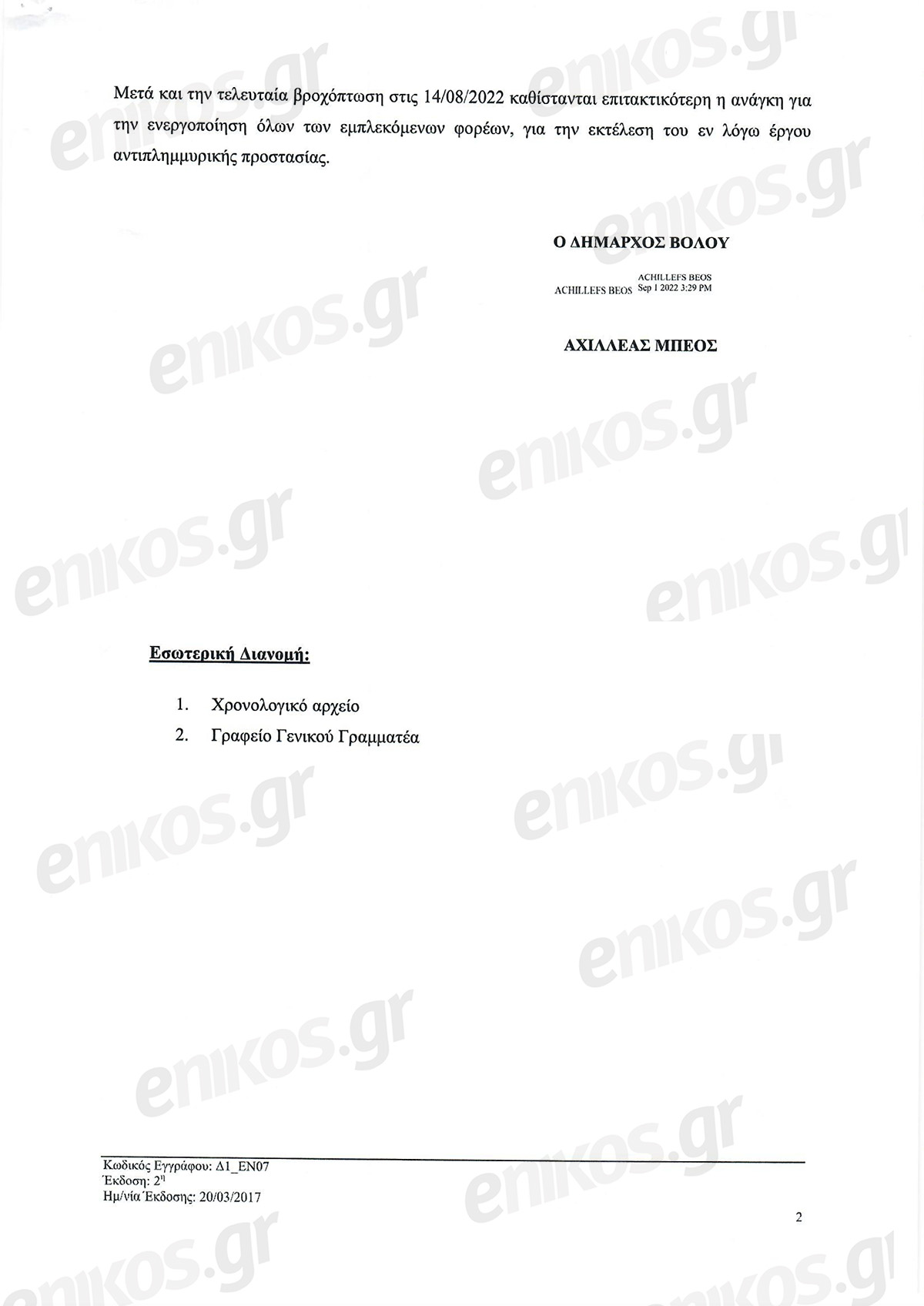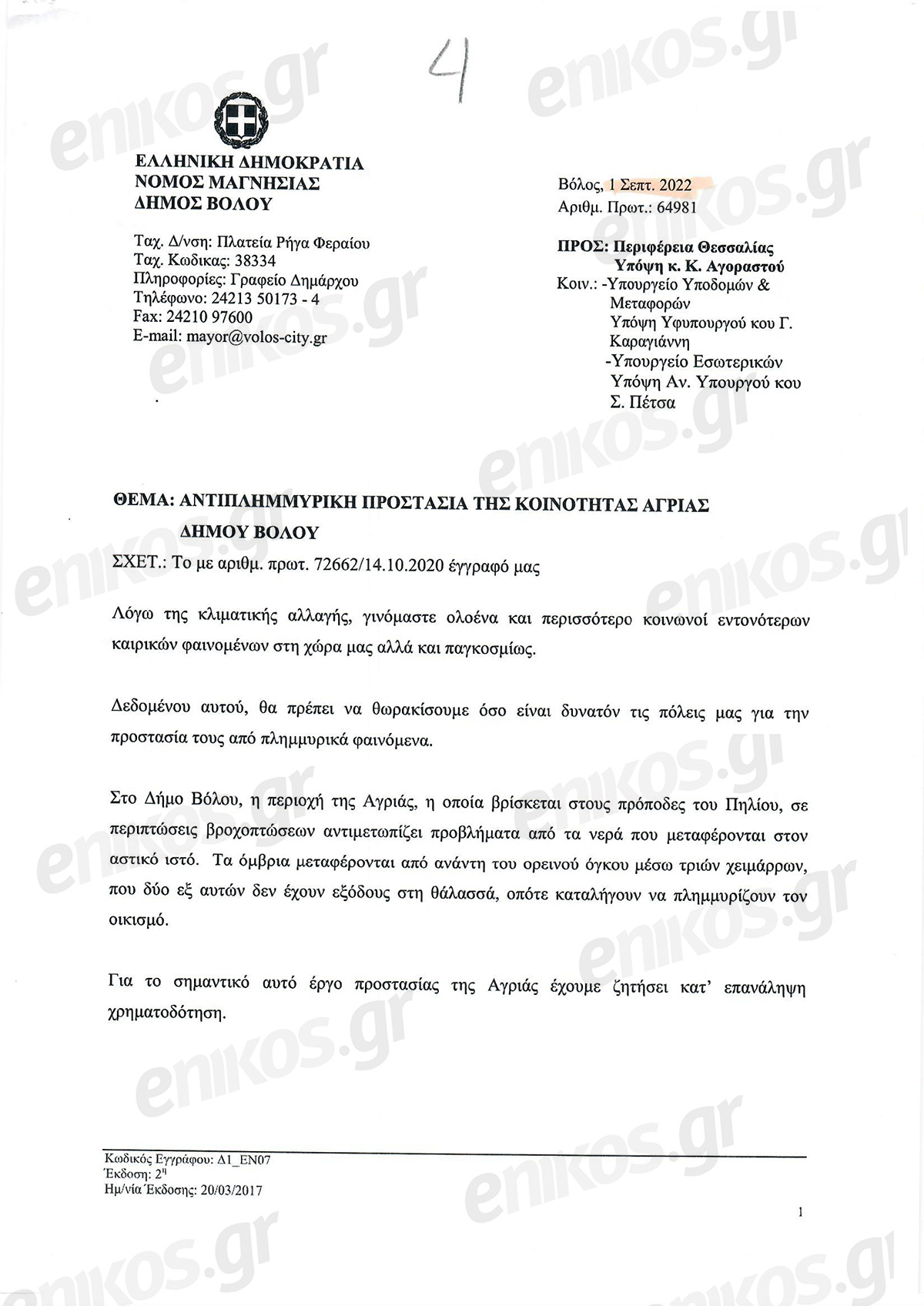 Περνά περίπου ένας χρόνος και ο κ. Μπέος επανέρχεται με νέο έγγραφο προς το υπουργείου Υποδομών, την 1η Οκτωβρίου 2020, δηλαδή λίγο μετά την επέλαση της κακοκαιρίας “Ιανός”. Το αίτημα ίδιο: θέλουμε έργα αντιπλημμυρικής προστασίας.