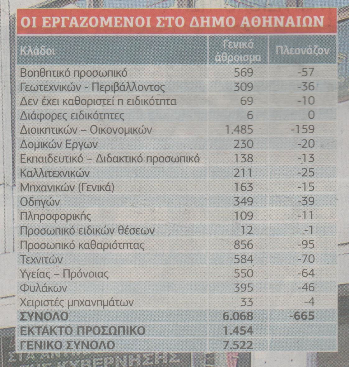 Το «μπουγιουρντί» που έφτασε χθες στον Δήμο Αθηναίων ενημερώνει ότι έχει 665 πλεονάζοντες εργαζόμενους σε σύνολο 6.068 μόνιμων εργαζόμενων και 1.454 εποχικών κάθε μορφής( γενικό σύνολο 7.522).