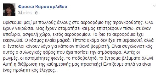 «Βρίσκομαι μαζί με πολλούς άλλους στο αεροδρόμιο της Φρανκφούρτης. Όλα έχουν νεκρώσει. Μας έχουν σταματήσει και μας επιστρέφουν πίσω, σε έναν υπαίθριο, ασφαλή χώρο, εκτός αεροδρομίου. Το ίδιο το αεροδρόμιο έχει εκκενωθεί. Ο κόσμος κλαίει μαζικά», αναφέρει χαρακτηριστικά η Φρόσω Καρασαρλίδου, η οποία μεταφέρει την αγωνία της για αυτά που συμβαίνουν στο αεροδρόμιο της Φρανκφούρτης.