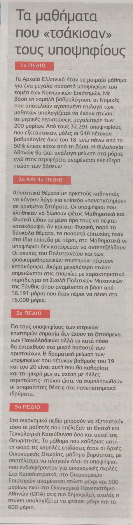 Σχεδόν καμία από τις σχολές που αποτελούν “όνειρο” για τους αναταγωνιστικότερους και καλύτερους υποψηφίους δεν αναμένεται να σκαρφαλώσει πάνω από 19.000 μόρια. Το μεγαλύτερο Βατερλώ στις εξετάσεις σημειώθηκε φέτος από τους υποψηφίους του 2ου και 4ου πεδίου. Πολλοί μαθητές σημείωσαν χαμηλές πτήσεις στις βαθμολογίες τους λόγω των απαιτητικών θεμάτων στις Πανελλάδικές, ιδιαίτερα στα Μαθηματικά, με αποτέλεσμα οι αριστούχοι να μειωθούν στο μισό σε σχέση με πέρσι. Με βάση τις φετινές βαθμολογίες προβλέπεται μείωση ακόμα και 400 μορίων στο Μαθηματικό Αθήνας, ενώ το Φυσικό κατρακυλάει ακόμα περισσότερο σημειώνοντας πτώση της τάξης των 500 μορίων. Παρόμοια κατάσταση επικρατεί και στις σχολές του ΕΜΠ, όπου οι Σχολές Μηχανικών Η/Υ και Μηχανολόγων Μηχανικών, από τις υψηλότερες του Μετσόβιου, αναμένεται να μην ξεπεράσουν τα 18.500-18.400 μόρια.