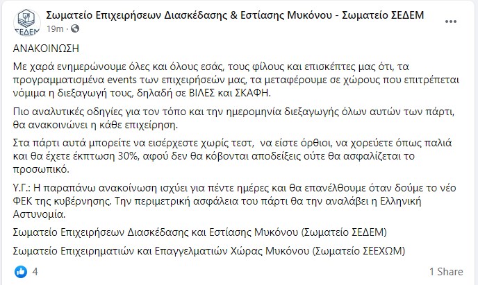 «Υ.Γ.1: Η παραπάνω ανακοίνωση ισχύει για πέντε ημέρες και θα επανέλθουμε όταν δούμε το νέο ΦΕΚ της κυβέρνησης. Την περιμετρική ασφάλεια του πάρτι θα την αναλάβει η Ελληνική Αστυνομία. Υ.Γ. 2: Η ανακοίνωση εκδίδεται μετά τα βίντεο που δημοσιοποιήθηκαν για το “υπέροχο” και “ανεμπόδιστο” πάρτυ που διοργανώθηκε χθες στο νησί μας. Σωματείο Επιχειρήσεων Διασκέδασης και Εστίασης Μυκόνου (Σωματείο ΣΕΔΕΜ), Σωματείο Επιχειρηματιών και Επαγγελματιών Χώρας Μυκόνου (Σωματείο ΣΕΕΧΩΜ)», αναφέρεται στο τέλος της ανακοίνωσης.