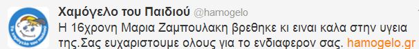Όπως έγραψε το Χαμόγελο του Παιδιού στο twitter, η 16χρονη είναι καλά στην υγεία της.