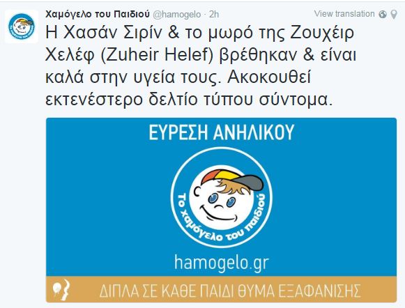 Σύμφωνα με το Χαμόγελο του παιδιού, η ανήλικη μητέρα και το μόλις 1,5 μηνών βρέφους της που εξαφανίστηκαν το μεσημέρι της Πέμπτης (24.11.2016) από το Καλοχώρι Θεσσαλονίκης βρέθηκαν σήμερα και είναι καλά στην υγεία τους.