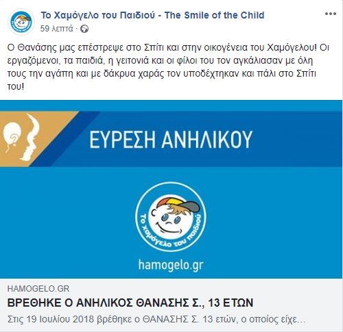 Ο 13χρονος Θανάσης που μεγάλωνε εδώ και 4 χρόνια στο Σπίτι του οργανισμού «Το Χαμόγελο του Παιδιού» στο Περιστέρι και είχε εξαφανιστεί στις 23 Μαρτίου –κάτω από αδιευκρίνιστες συνθήκες- επέστρεψε μόνος του στο Σπίτι του.