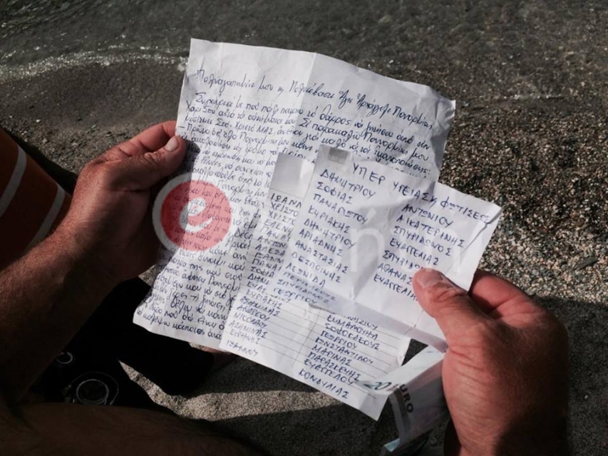 «Επειδή δεν γνώριζα τι ήταν, μαζί με τον ξάδελφο μου που ήταν μαζί μου, το άνοιξα. Διαπίστωσα ότι το μπουκάλι περιείχε τρεις επιστολές και ένα χαρτονόμισμα των 20 ευρώ. Το ένα χαρτί έγραφε «Υπέρ Υγείας», το άλλο «Υπέρ Αναπαύσεως» και το τρίτο ήταν ένα γράμμα αφιερωμένο στον Πανορμίτη με κάποιο πρόβλημα του ανθρώπου που το έγραψε. Ζητούσε να τον βοηθήσει ο Αρχάγγελος, στο τέλος της επιστολής ήταν γραμμένο το όνομα του και το τηλέφωνό του», ανέφερε ο λουόμενος, δείχνοντας στον φωτογραφικό φακό τα ευρήματά του.