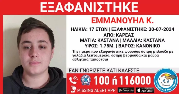 Σύμφωνα με το «Χαμόγελο του Παιδιού», τα ίχνη του Εμμανουήλ Κ. 17 ετών χάθηκαν στις 30 Ιουλίου, μεσημεριανές ώρες.