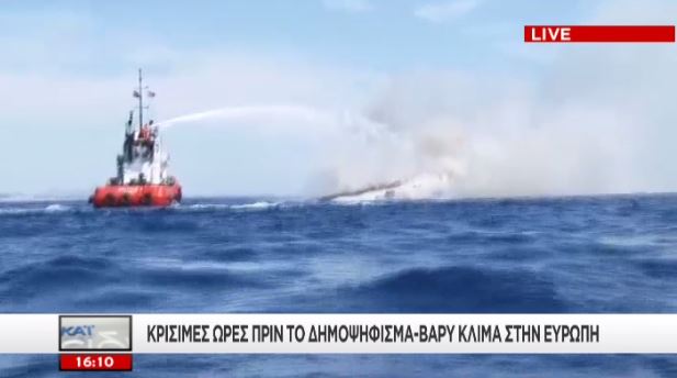Πλοιάριο της πυροσβεστικής έσπευσε στο σημείο για την κατάσβεση της φωτιάς, ενώ όπως φαίνεται στα πλάνα του ΣΚΑΪ το σκάφος έχει αρχίσει να βυθίζεται.