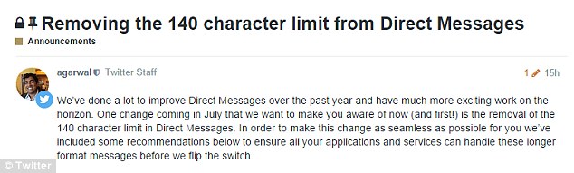 Αλλαγές έρχονται στο twitter μέσα στον μήνα Iούλιo. ‘Οπως ανακοινώθηκε τον επόμενο μήνα πρόκειται να καταργηθεί ο περιορισμός των 140 χαρακτήρων στα απευθείας μηνύματα (Direct Messages) μεταξύ των χρηστών.