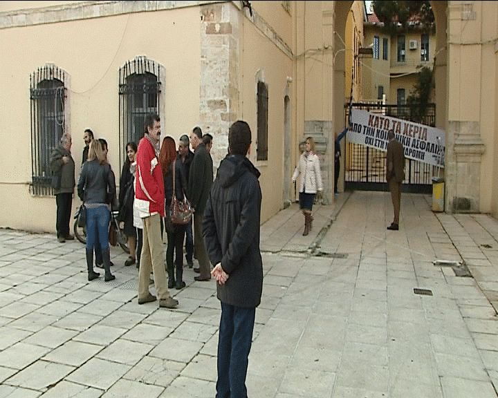 Στις εξωτερικές πόρτες του δικαστικού μεγάρου έχουν τοποθετηθεί λουκέτα, ενώ υπάρχει και πανό με αίτημα την απόσυρση του νομοσχεδίου για το ασφαλιστικό.