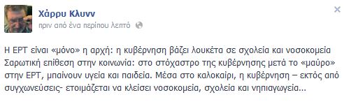 Σαρωτική επίθεση στην κοινωνία: στο στόχαστρο της κυβέρνησης μετά το «μαύρο» στην ΕΡΤ, μπαίνουν υγεία και παιδεία. Μέσα στο καλοκαίρι, η κυβέρνηση – εκτός από συγχωνεύσεις- ετοιμάζεται να κλείσει νοσοκομεία, σχολεία και νηπιαγωγεία…”, ήταν το σχόλιο του Χάρρυ Κλυνν.