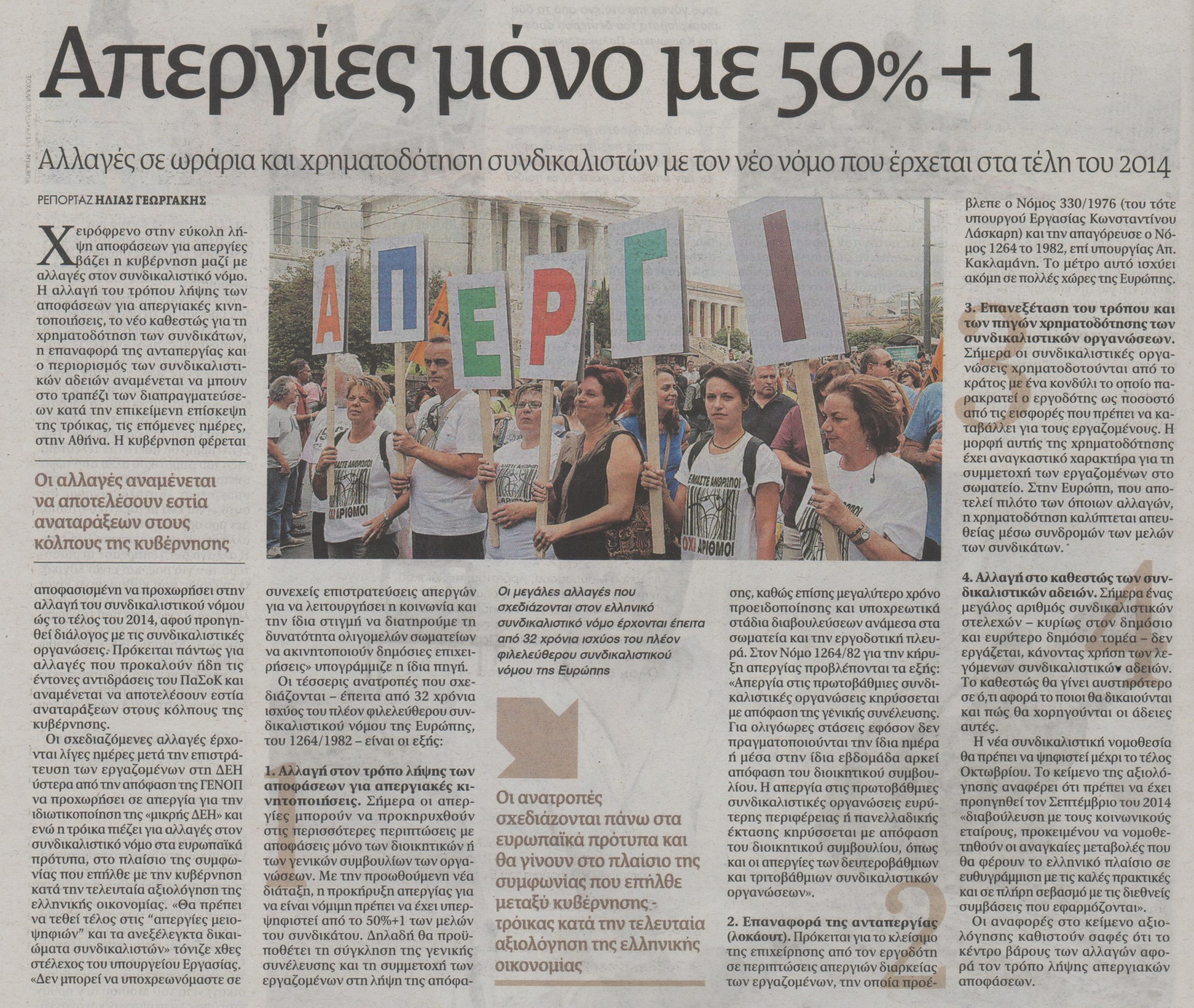 Η κυβέρνηση φέρεται αποφασισμένη να προχωρήσει στην αλλαγή του συνδικαλιστικού νόμου ως το τέλος του 2014, αφού προηγηθεί διάλογος με τις συνδικαλιστικές οργανώσεις. Πρόκειται πάντως για αλλαγές που προκαλούν ήδη τις αντιδράσεις του ΠΑΣΟΚ και αναμένεται να αποτελέσουν εστία αναταράξεων στους κόλπους της κυβέρνησης.