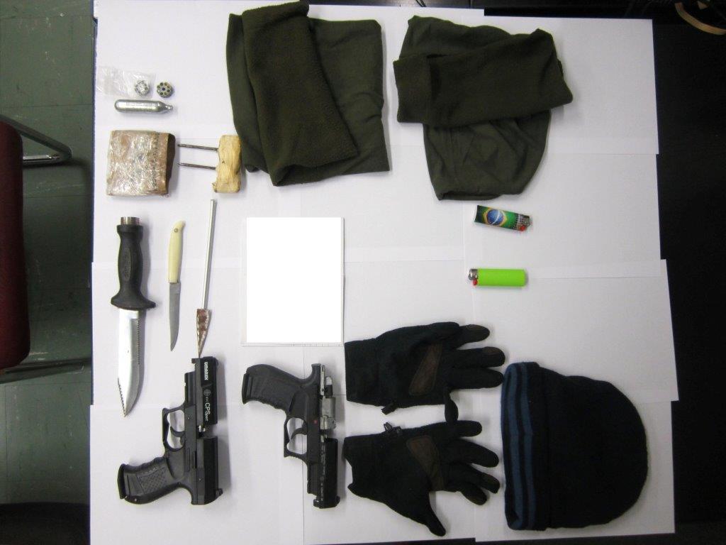Στην κατοχή του 63χρονου βρέθηκαν και κατασχέθηκαν επίσης ένα περιλαίμιο και ένας αναπτήρας, ενώ στην κατοχή του γιου του ένα μαχαίρι, ένας σκούφος, ένα ζευγάρι γάντια και ένας αναπτήρας.