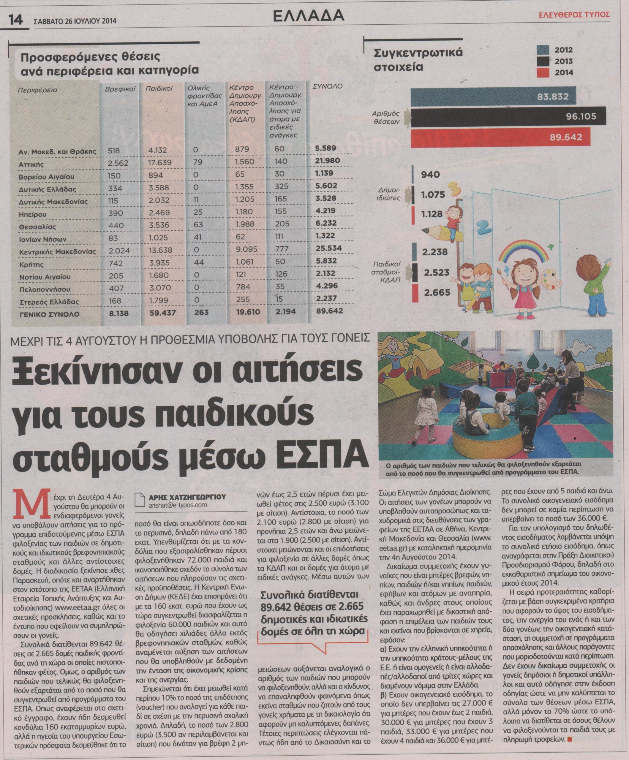 Μέχρι τη Δευτέρα 4 Αυγούστου, θα μπορούν οι ενδιαφερόμενοι γονείς να υποβάλουν αιτήσεις για το πρόγραμμα επιδοτούμενης μέσω ΕΣΠΑ φιλοξενίας των παιδιών σε δημοτικούς και ιδιωτικούς βρεφονηπιακούς σταθμούς και άλλες αντίστοιχες δομές.