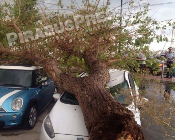 Ξεριζώθηκαν δέντρα και έπεσαν πάνω σε αυτοκίνητα στον Πειραιά – ΒΙΝΤΕΟ