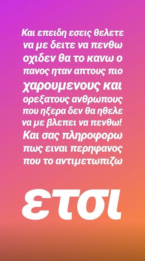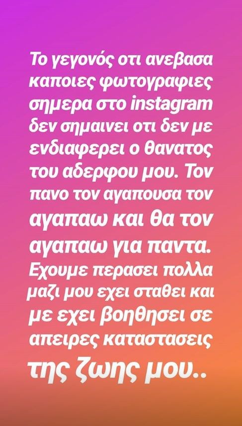 Ο αδελφός τους αδικοχαμένου Πάνου Ζάρλα αποδημοσίευσε τις συγκεκριμένες φωτογραφίες και έκανε νέα ανάρτηση στην οποία έγραψε: “Το γεγονός ότι ανέβασα κάποιες φωτογραφίες σήμερα στο Instagram δεν σημαίνει ότι δεν με ενδιαφέρει ο θάνατος του αδελφού μου. Τον Πάνο τον αγαπούσα, τον αγαπάω και θα τον αγαπάω για πάντα. Έχουμε περάσει πολλά μαζί και μου έχει σταθεί και με έχει βοηθήσει σε άπειρες καταστάσεις της ζωής μου… Και επειδή εσείς θέλετε να με δείτε να πενθώ, όχι δεν θα το κάνω. Ο Πάνος ήταν από τους πιο χαρούμενους και ορεξάτους ανθρώπους που ήξερα, δεν θα ήθελε να με βλέπει να πενθώ! Και σας πληροφορώ πως είναι υπερήφανος που το αντιμετωπίζω έτσι”.