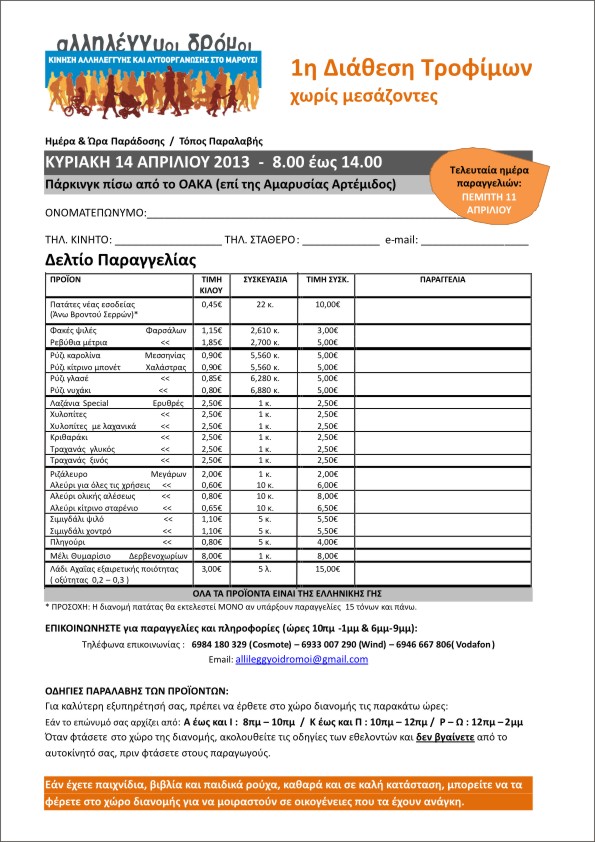 Ξεκινάµε λοιπόν τη δράση µας αντιστεκόµενοι στην κερδοσκοπία µιας χούφτας µονοπωλιακών οµίλων και µεγάλων αλυσίδων εµπορίας τροφίµων που ελέγχουν και καθορίζουν τις τιµές βασικών προϊόντων. Καταργούµε τους χονδρέµπορους και τους µεσάζοντες εξασφαλίζοντας τη διάθεση προϊόντων απευθείας από τον παραγωγό στον καταναλωτή προµηθεύοντας φτηνά και ποιοτικά βασικά είδη διατροφής.