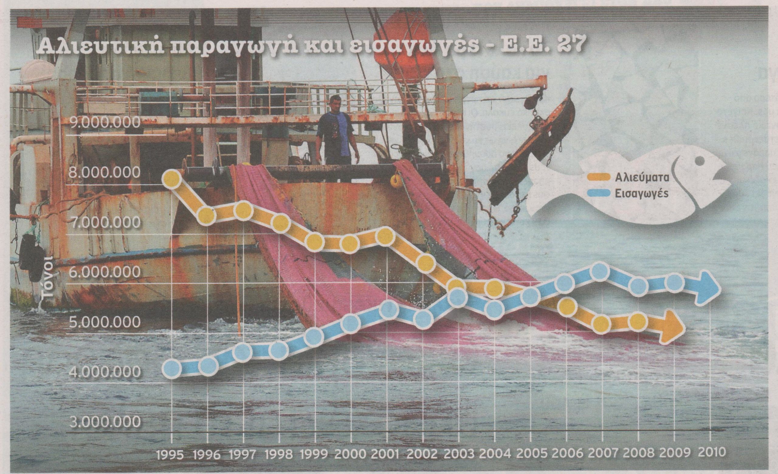 Οσο κι αν δείχνουν ανεξάντλητα, δεν είναι… Τα ψάρια στις ελληνικές θάλασσες θα είχαν από τον Αύγουστο αφανιστεί, αν η χώρα μας στηριζόταν μόνο στην ντόπια παραγωγή για να καλυφθεί η ζήτηση και δεν εισήγε αλιεύματα, σύμφωνα με πανευρωπαϊκή έρευνα.Από το 1990 μέχρι και το 2009 τα ψάρια της Ελλάδας… εξαντλούνται κάθε χρόνο κοντά στον Αύγουστο, με τάσεις επιδείνωσης.Για το σύνολο της ΕΕ οι δείκτες είναι ακόμη χειρότεροι, αφού το 2009 τα ψάρια κάλυπταν μόλις το 50% της ετήσιας ζήτησης.ΠΑΤΗΣΤΕ ΠΑΝΩ ΣΤΗ ΦΩΤΟ ΓΙΑ ΜΕΓΑΛΥΤΕΡΗ ΑΝΑΛΥΣΗ