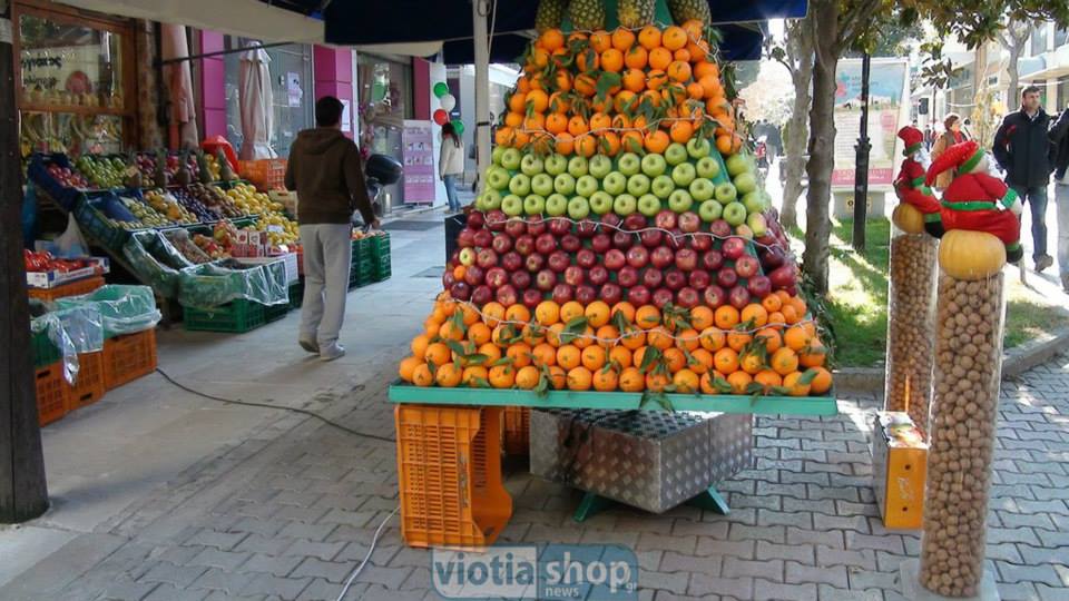 Στον πεζόδρομο της Θήβας κατά την διάρκεια των γιορτών ο ιδιοκτήτης ενός οπωροπωλείου είχε την ιδέα να στολίσει το δικό του Χριστουγεννιάτικο δέντρο με τα προϊόντα που έχει στο μαγαζί του.